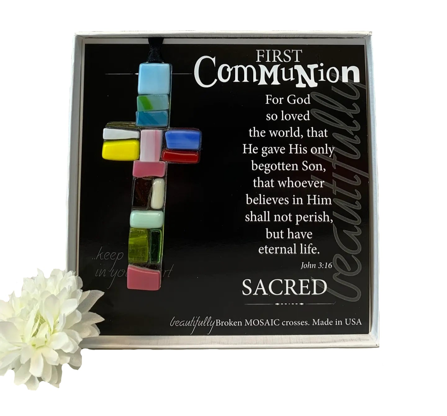 Gift-boxed in white 5.5 x 5.5" box with clear lid with First Communion sentiment and art.