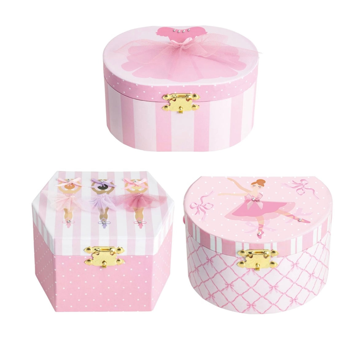 Paper wrapped wind-up musical jewelry box with mesh tutu and gem details features ring holder, spinning ballerina(s) and plays a sweet musical tune.
