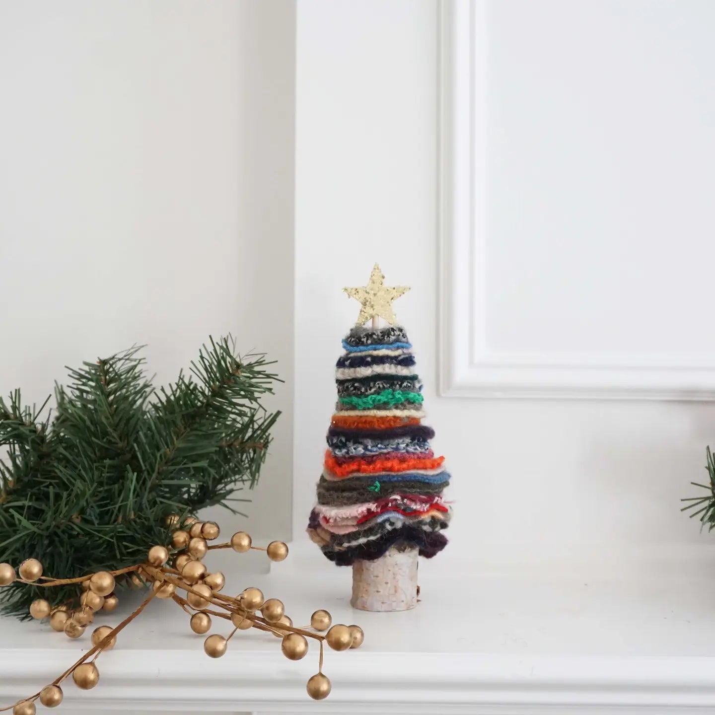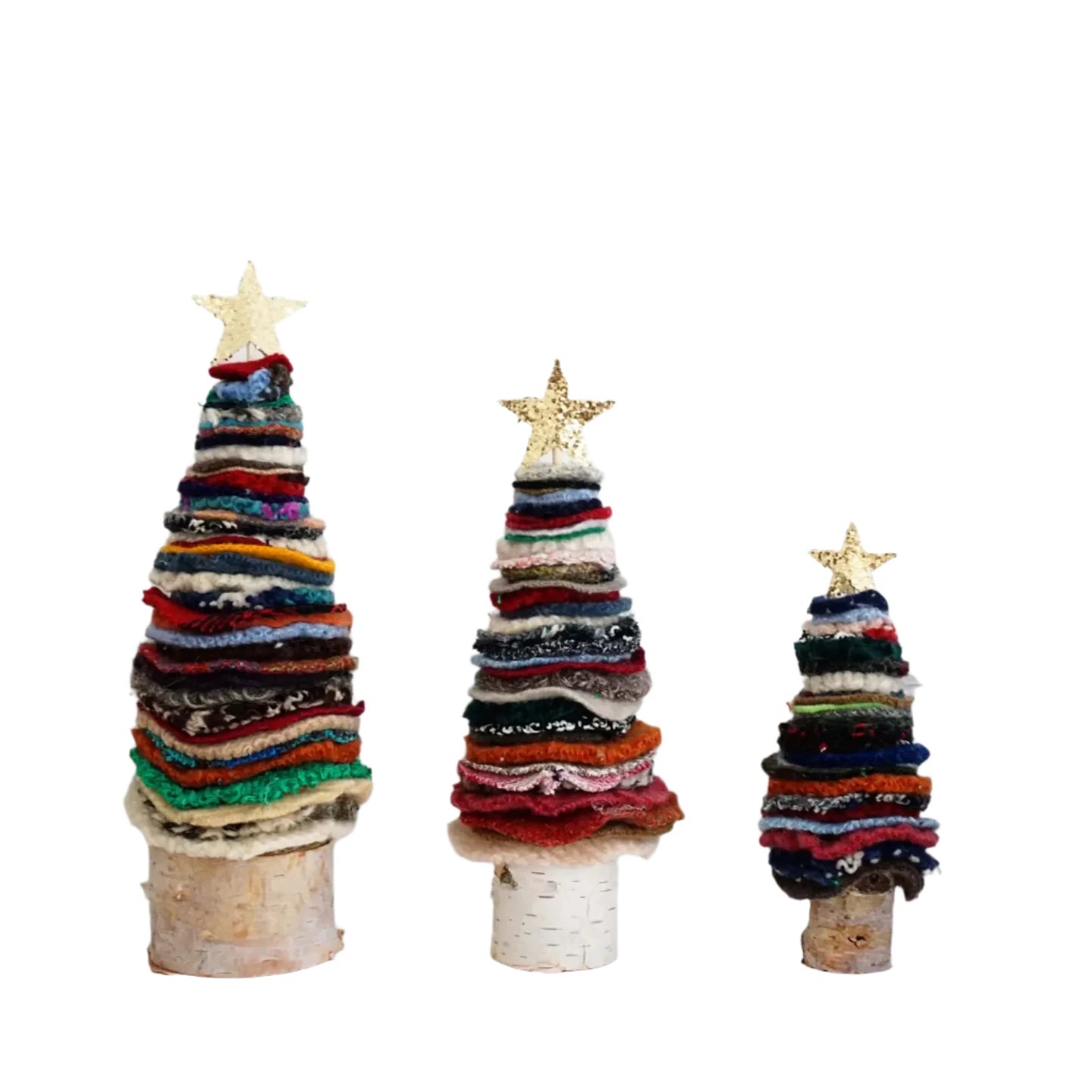 This fun and colorful Christmas tree is a great addition to your holiday decor! Made from scraps of recycled felted wool, these trees are handmade and feature a glittery gold star on top and a birch wood base!