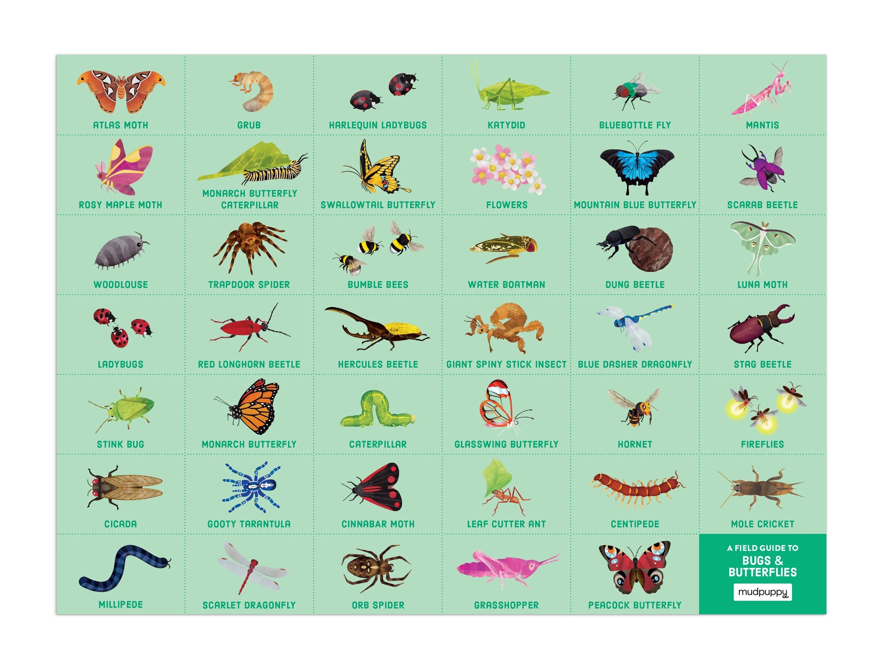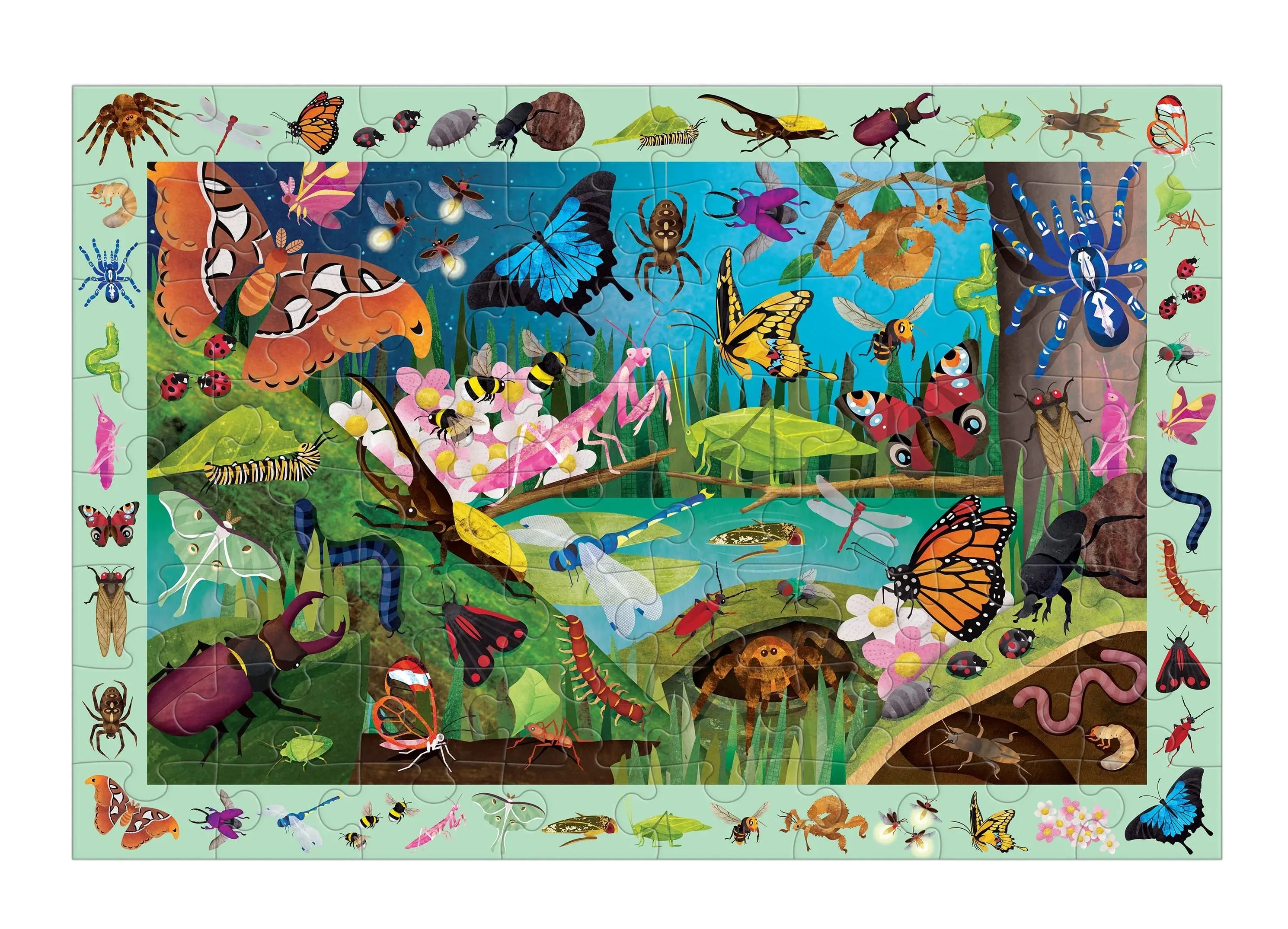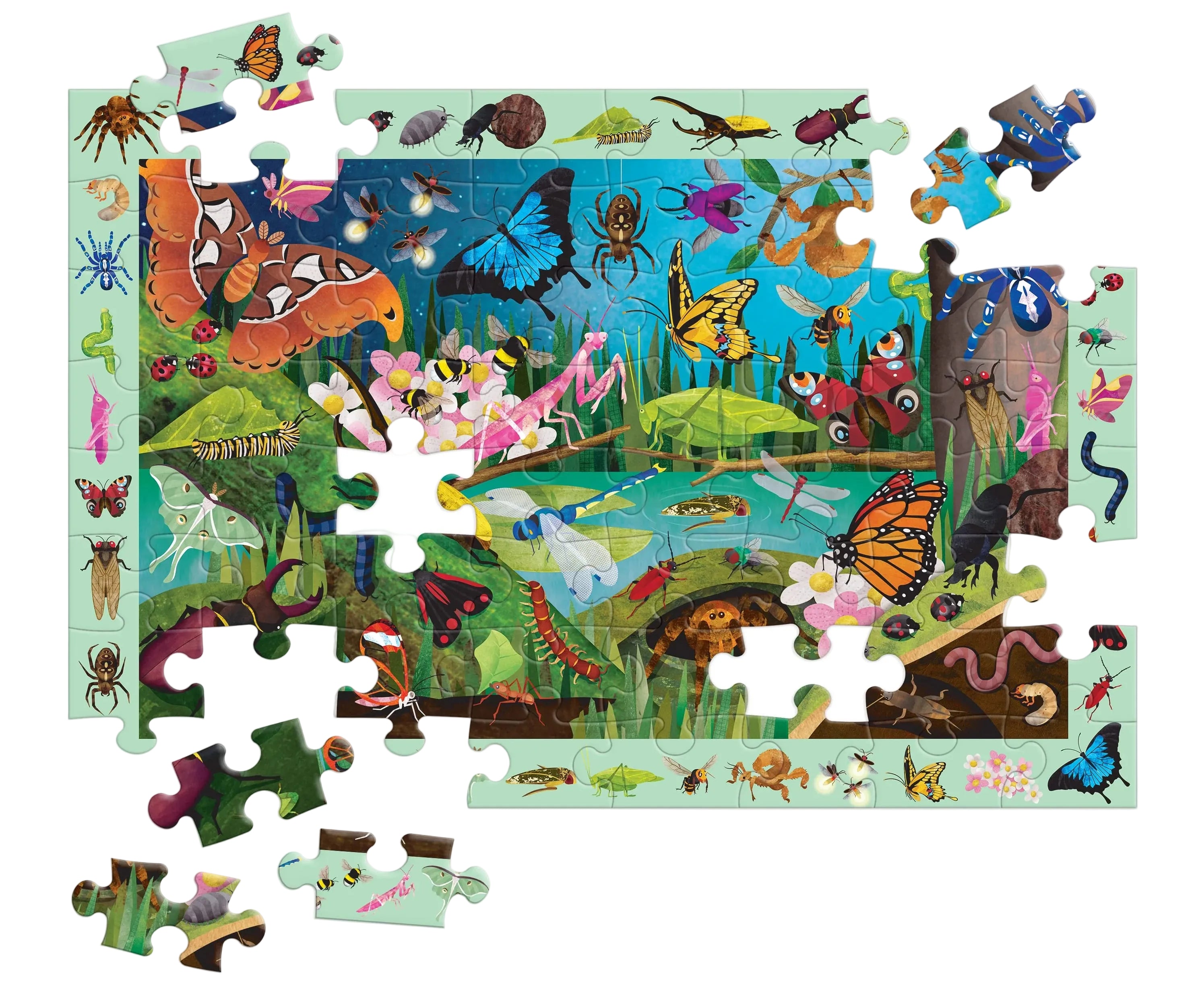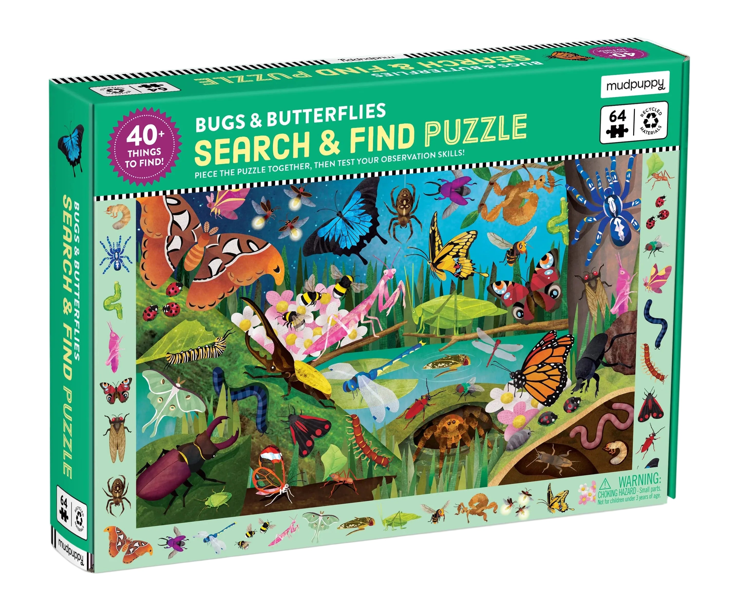 First, children can piece together the 64-piece puzzle featuring a colorful assortment of insects that live in the wild, such as the Atlas Moth, Fireflies, Ladybugs and more! After putting the puzzle together, children can test their observation skills to find the 40+ bugs and butterflies in the border around the puzzle image. Can you find them all?