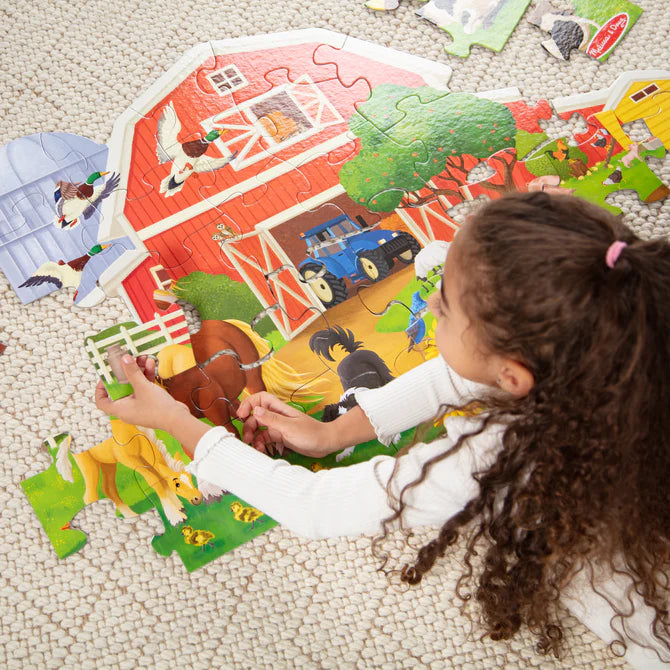 Explore the exciting life on a farm with this 32-piece barn-shaped floor puzzle for kids. The completed scene will measure 3 x 2 feet and features common farm animals and their lovable babies inside the barn and around the yard, giving kids many details to discover, point out and talk about.
