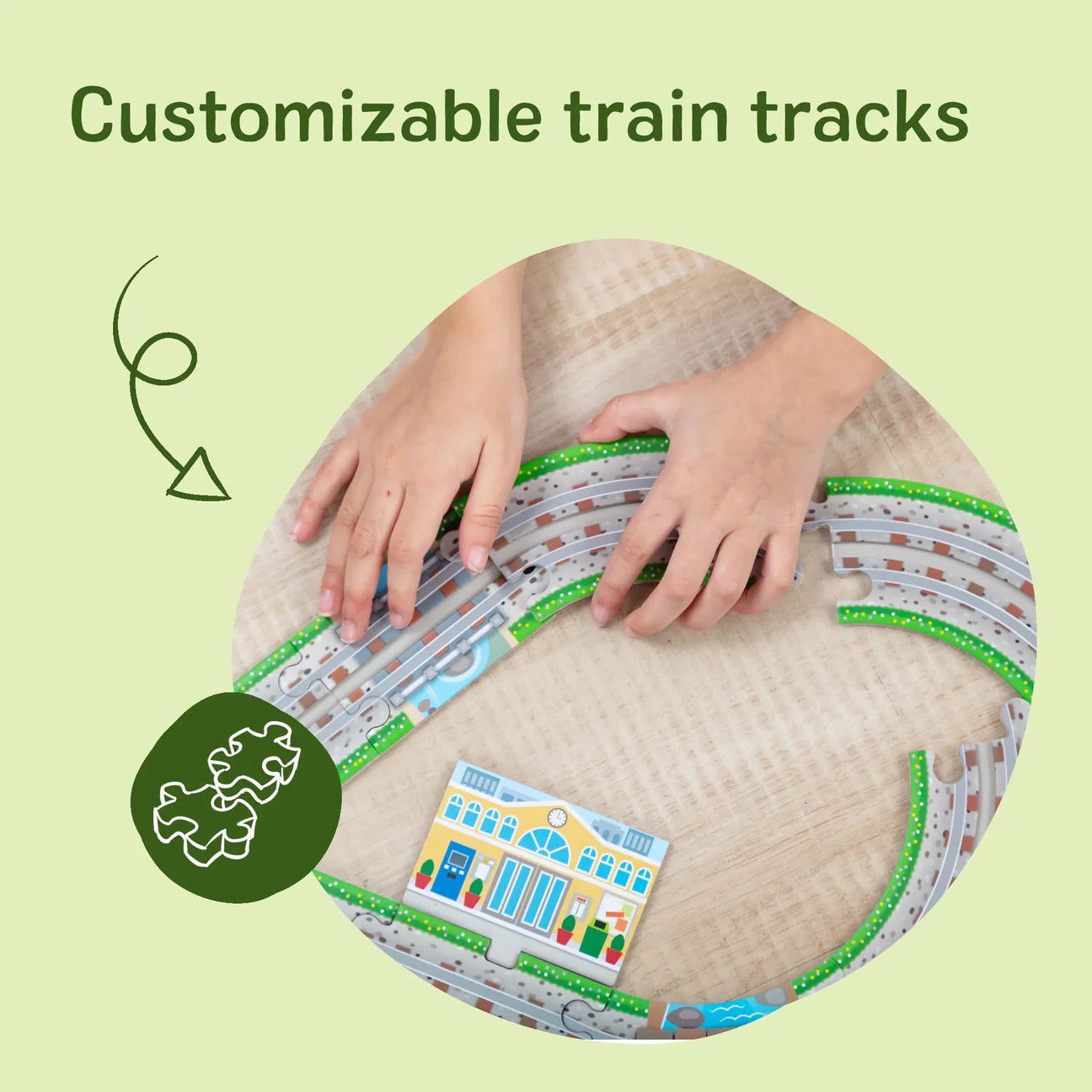 Build & Customize Train Tracks: Connect puzzle pieces with built-in grooves to form track layouts, then wind up the two trains to make them race along routes they arrange, adjust, and rebuild across multiple configurations