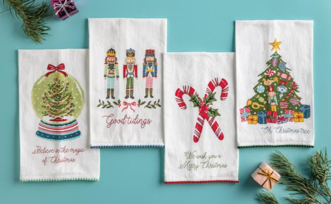 Cotton hand towel with contrast mini pom trim; perfect for the holidays!