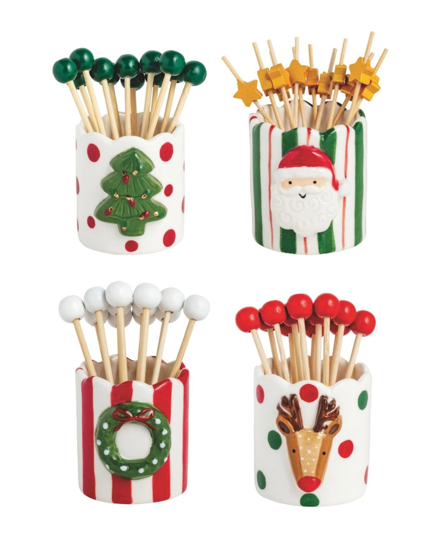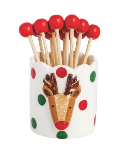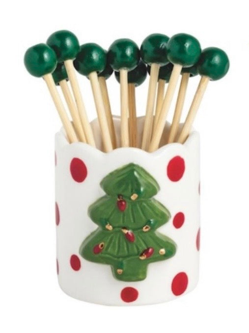 Hand-painted stoneware caddy comes with pack of wooden toothpicks with icon topper. Set comes wrapped in cello.