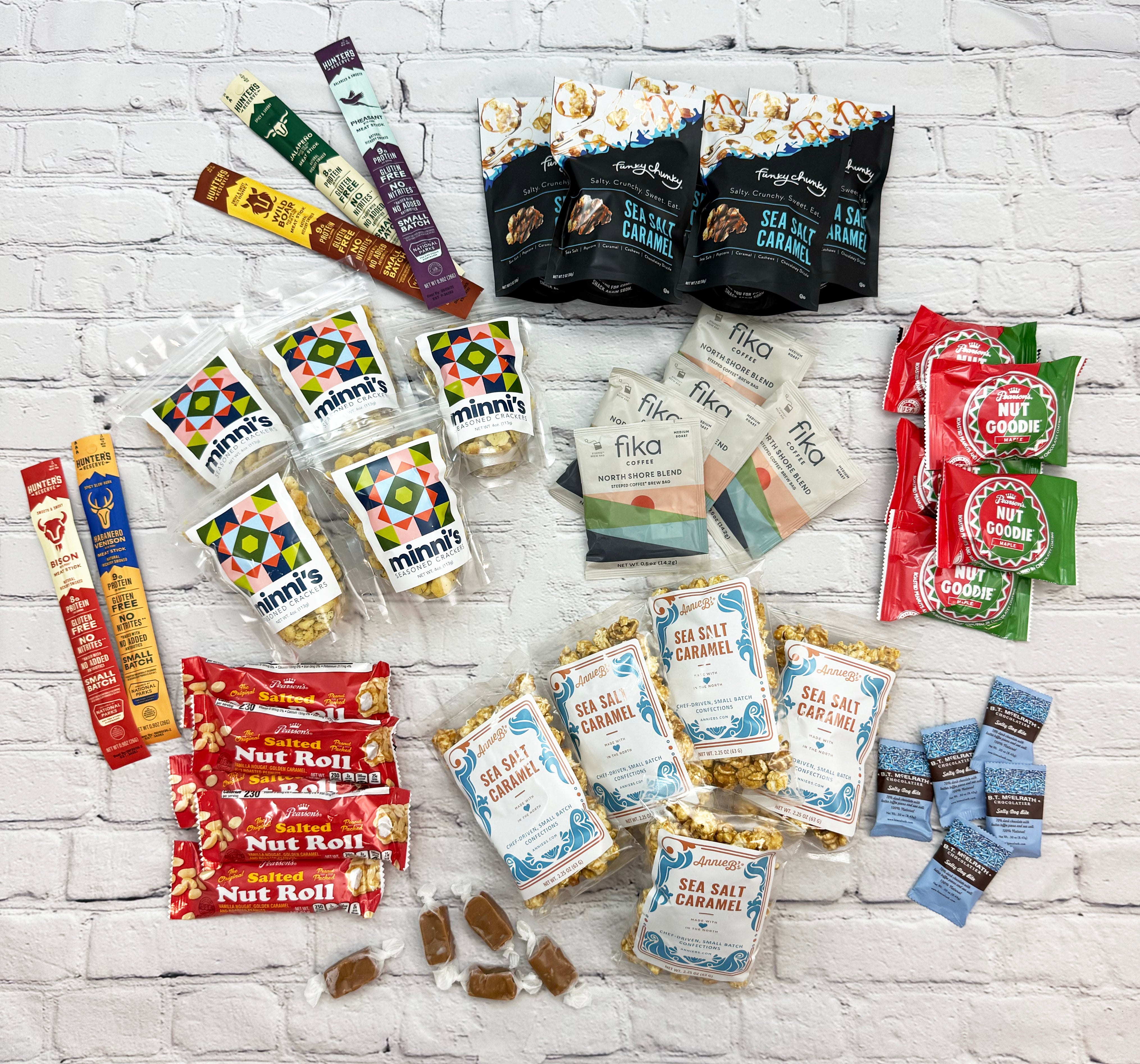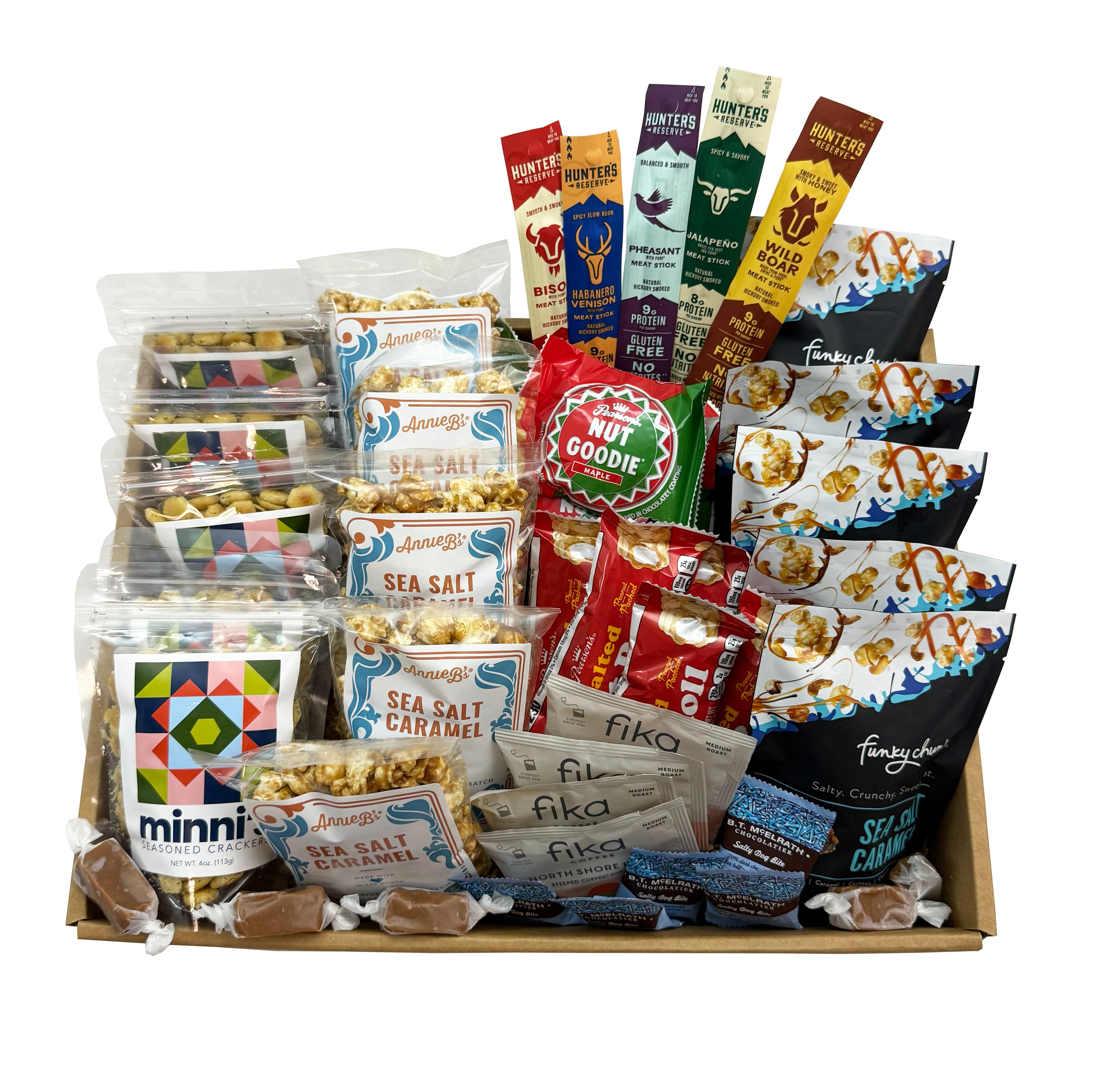 Includes: Pearson's Nut Goodies and Salted Nut Rolls, BT Chocolate Bites, Funky Chunky, Annie B’s Sea Salt Caramel Corn, Hunter's Reserve Meat Sticks, Minni Crackers, Fika Coffee and Knudsen Caramels.
