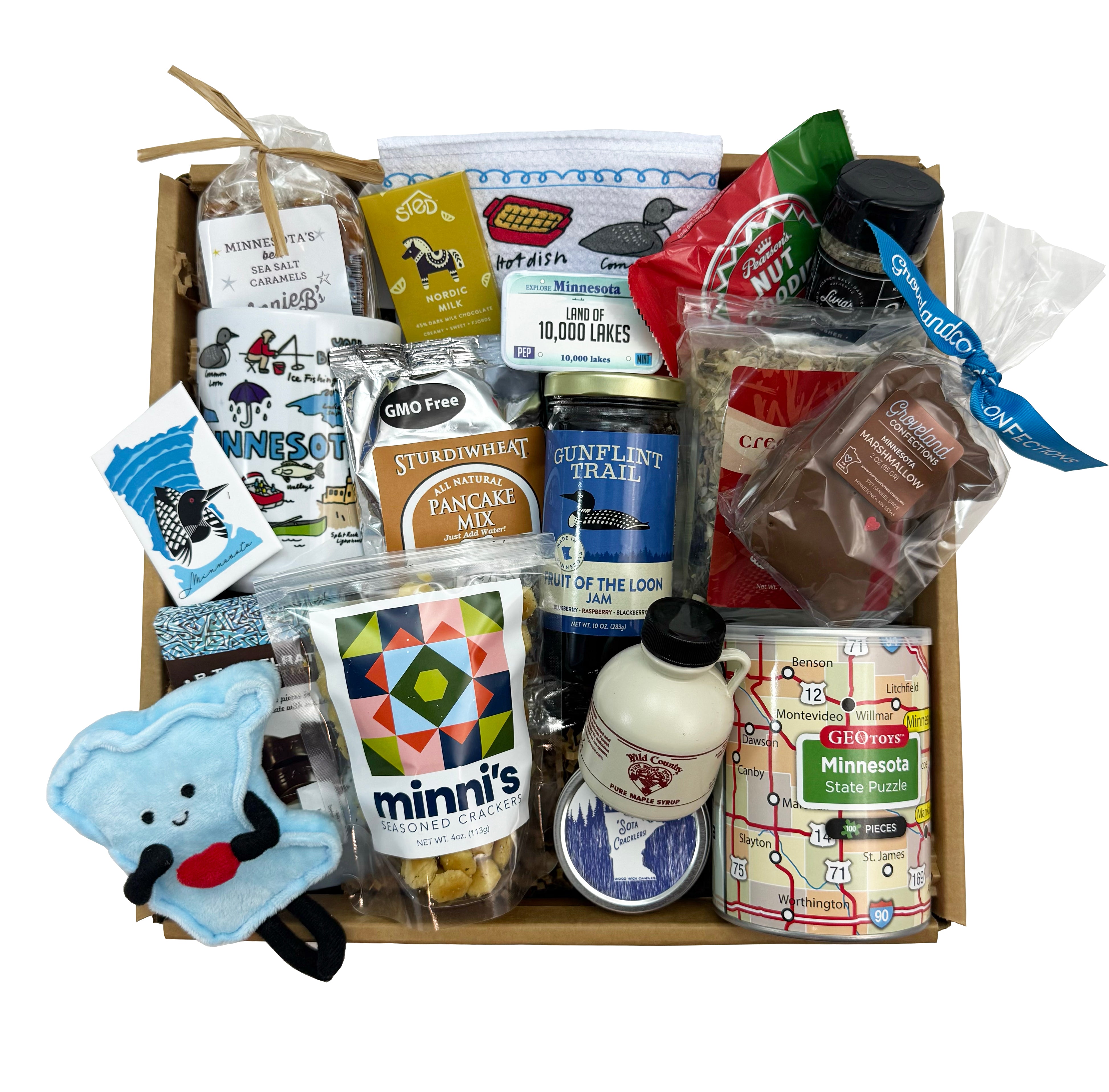 Includes: Cream of Wild Rice Soup, Minnesota Mug, Sted Chocolate Bar, Annie B's Caramels, Minnesota Towel, Gunflint Trail Jam, Sota Cracklers Candle, Minnesota Magnet, Sturdiwheat Pancake Mix, Wild Country Maple Syrup, BT Chocolate Bar, Minnesota Map Puzzle, Pearson’s Nut Goodie, Minnesota Mints, Minni Crackers, Minnesota Chocolate Covered Marshmallow, Minnesota Plushie and Livia’s Seasoning.