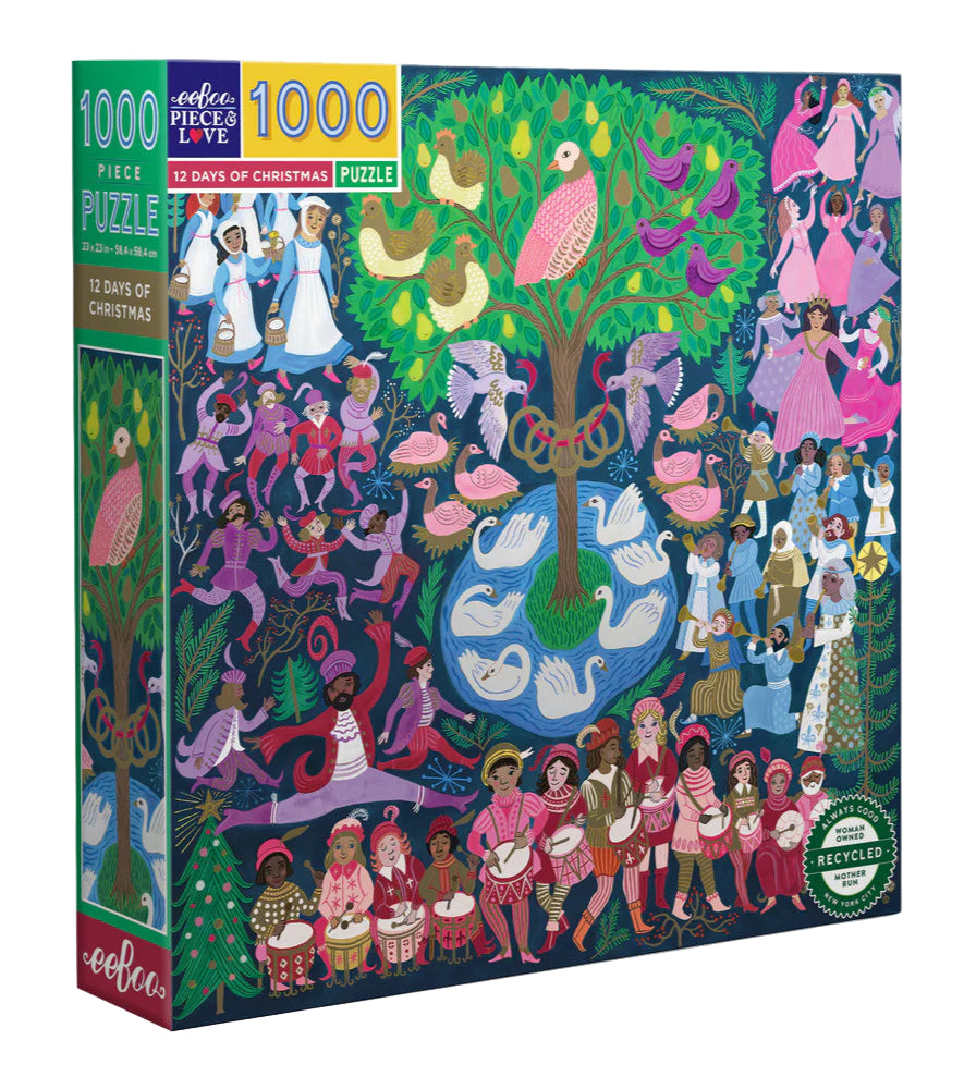 12 Days of Christmas is a 1000 piece Holiday jigsaw puzzle with matte gold highlights. A visual realization of all the verses of the beloved and merrily absurd holiday song! Merrily illustrated by Cynthia Cliff.