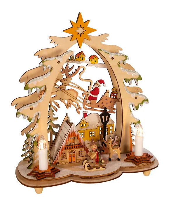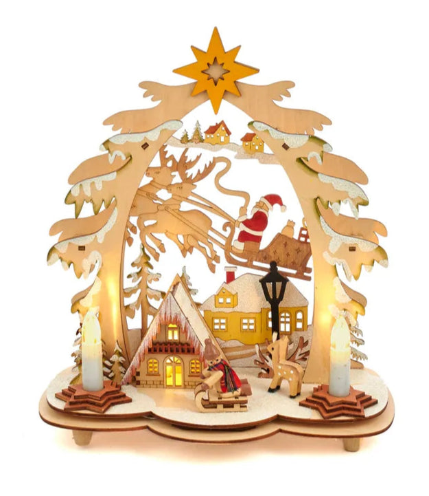 This table piece features multiple snow covered houses with Santa and his reindeer. There is an over arching tree with a Star of Bethlehem. When switched on, this village lights up for a festive glow!