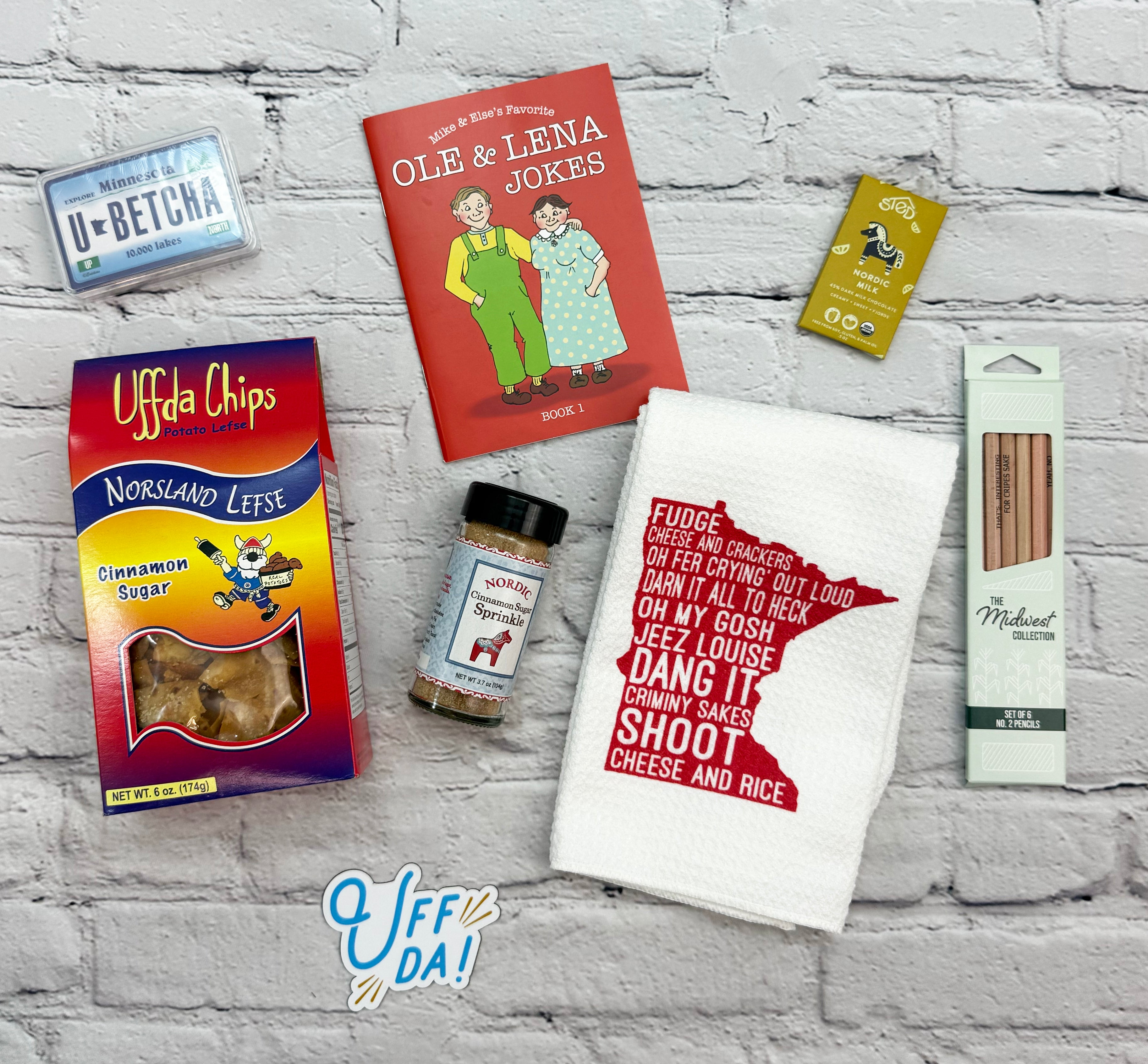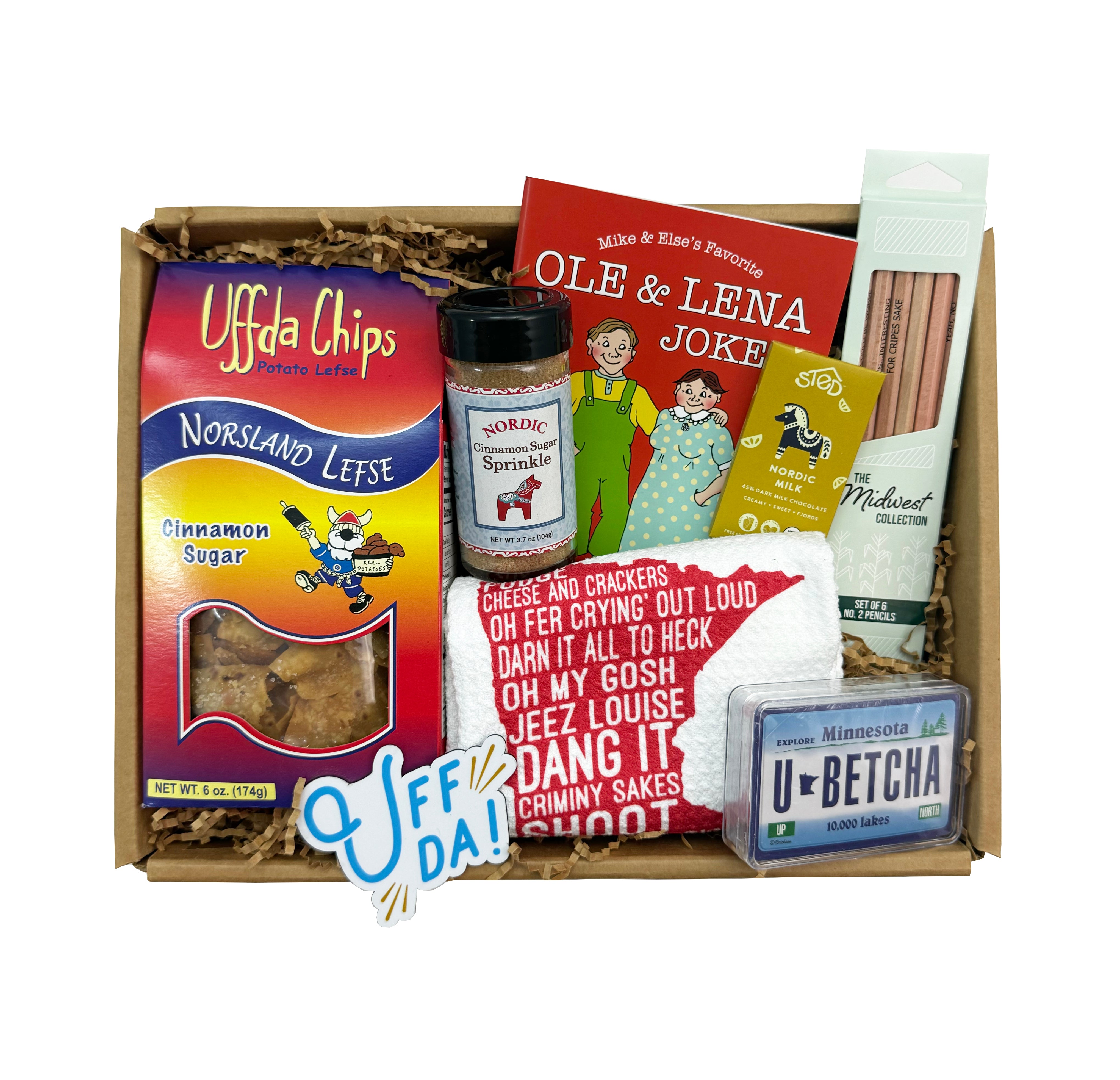 Includes: Ole & Lena Joke Book, Minnesota Playing Cards, Midwest Pencils, Minnesota Magnet, Minnesota Towel, Uffda Lefse Chips, Nordic Sprinkle and Sted Chocolate Bar.