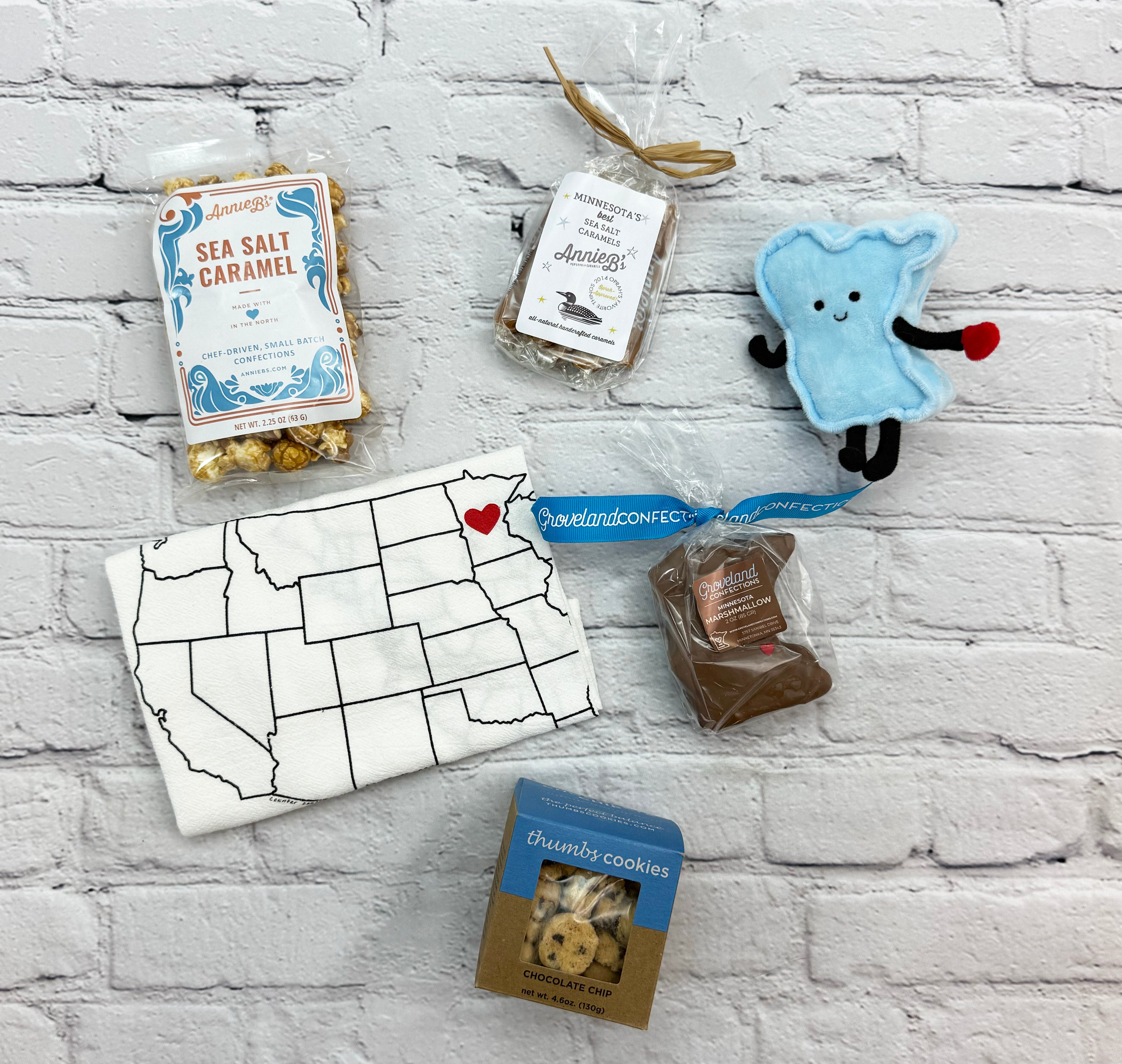 Includes: Annie B's Caramels, Chocolate Covered Minnesota Marshmallow, Thumbs Cookies, Minnesota Dishtowel and a Minnesota Magnet.