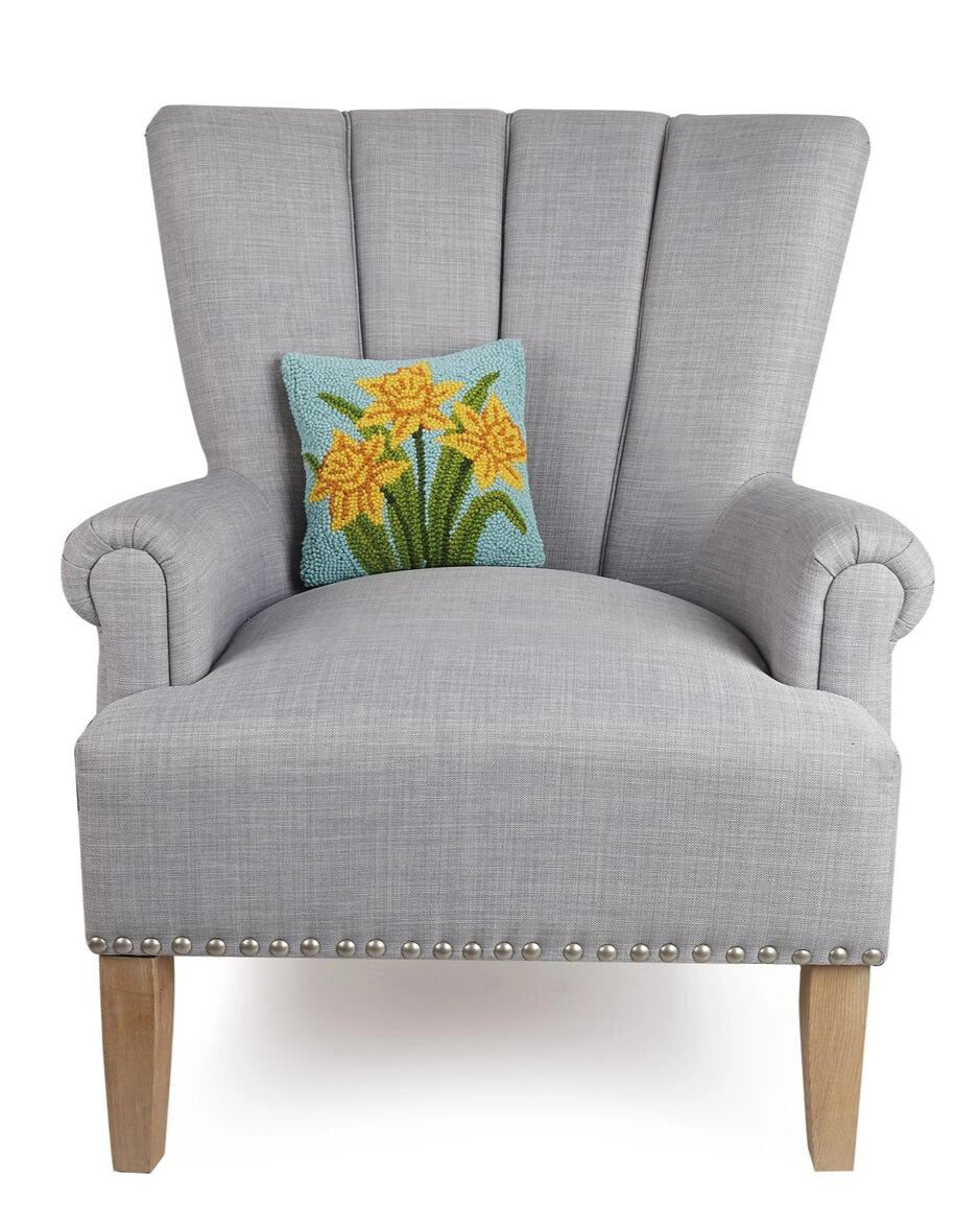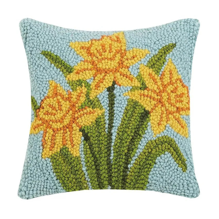 Add some charm to your decor with this handcrafted small hooked wool pillow showcasing beautiful daffodils!