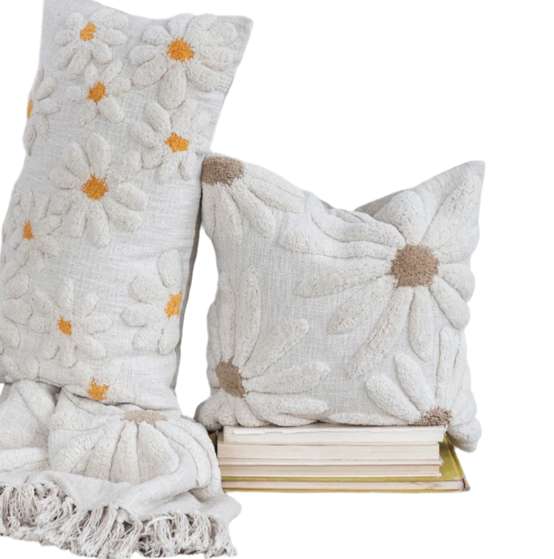 Cotton Slub Pillow w/ Tufted Flowers, Natural & Tan Color