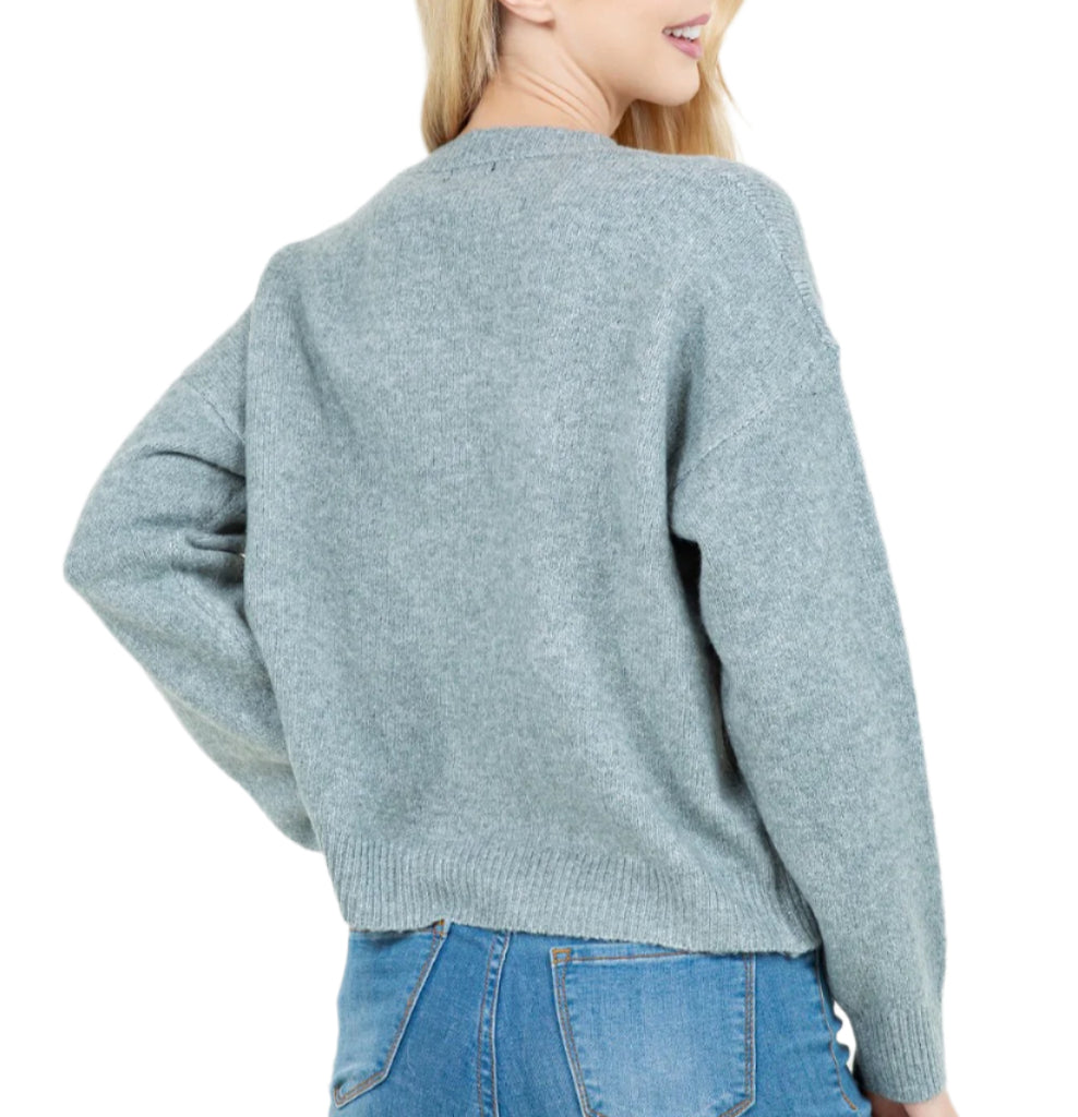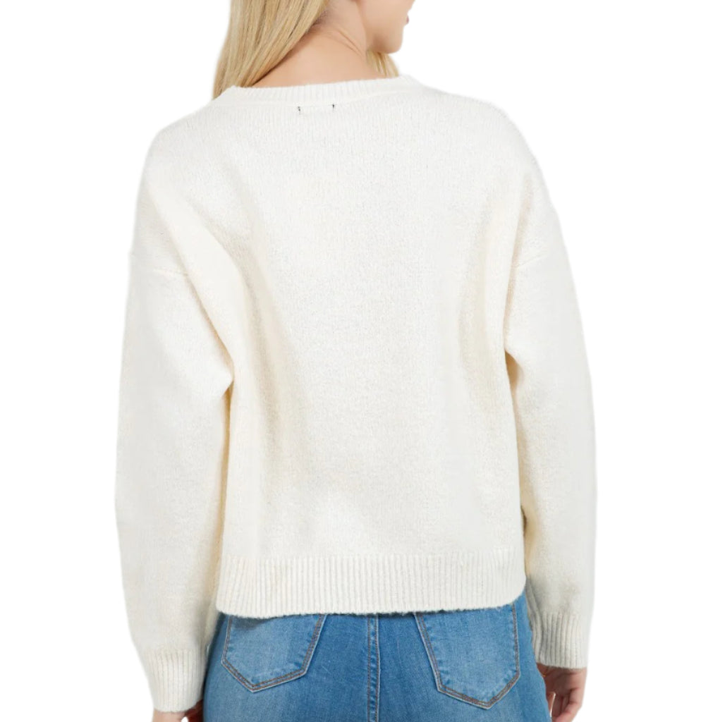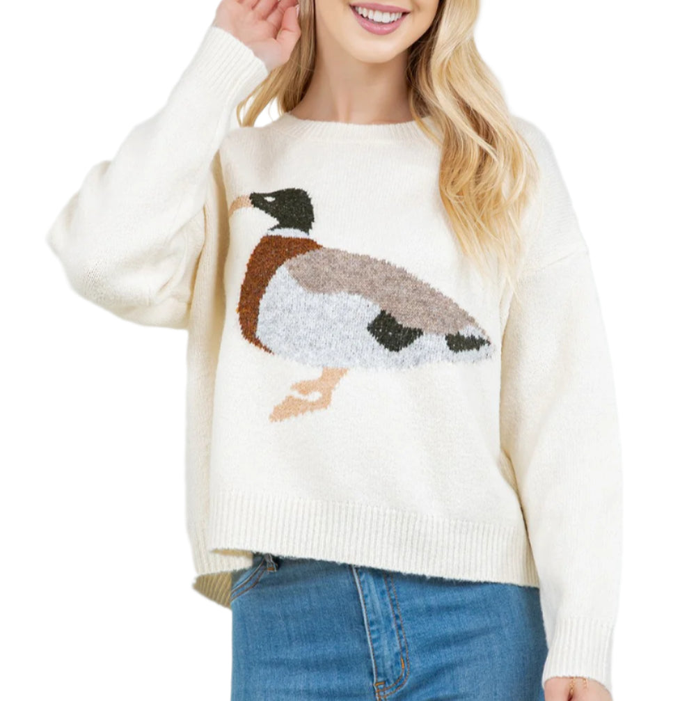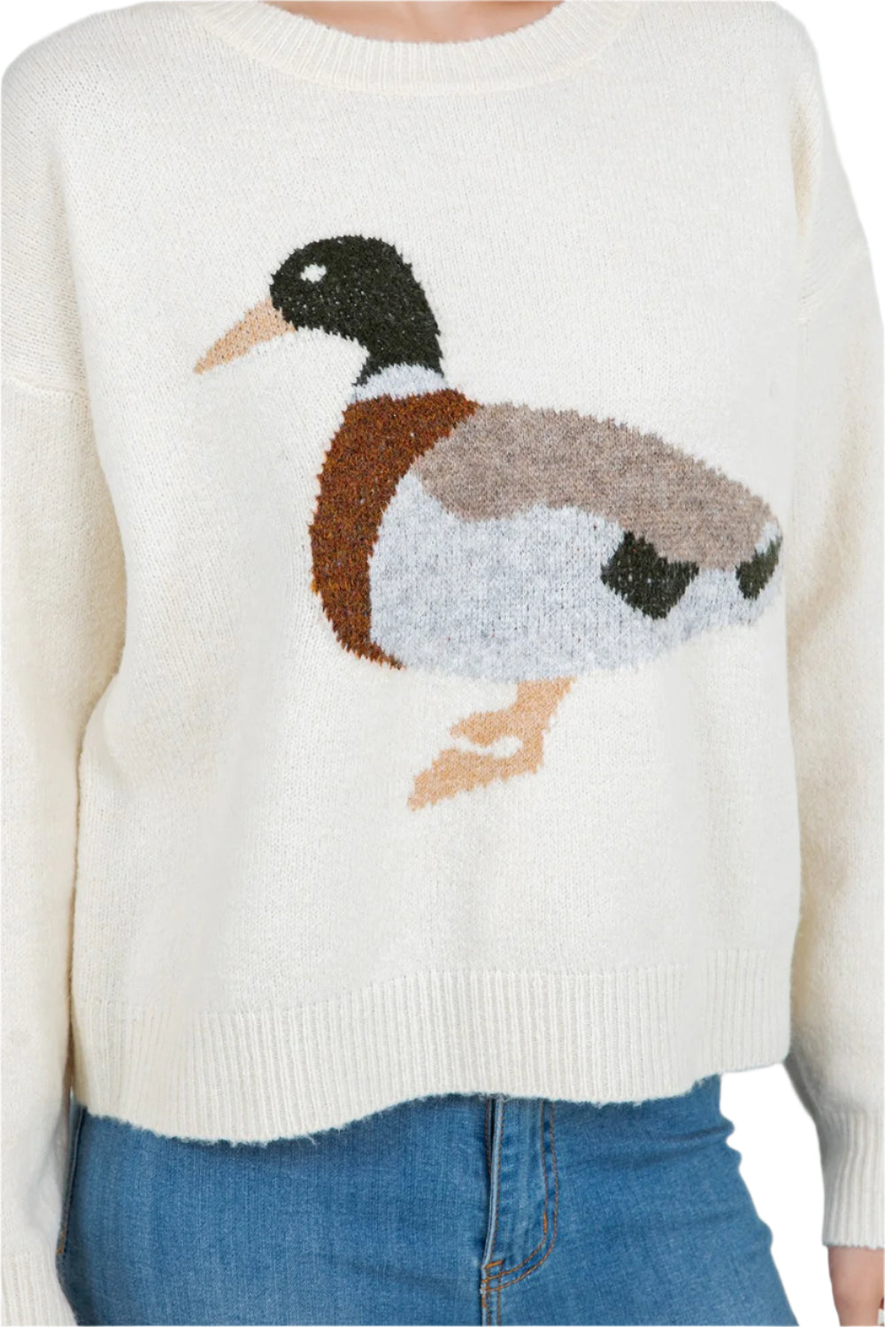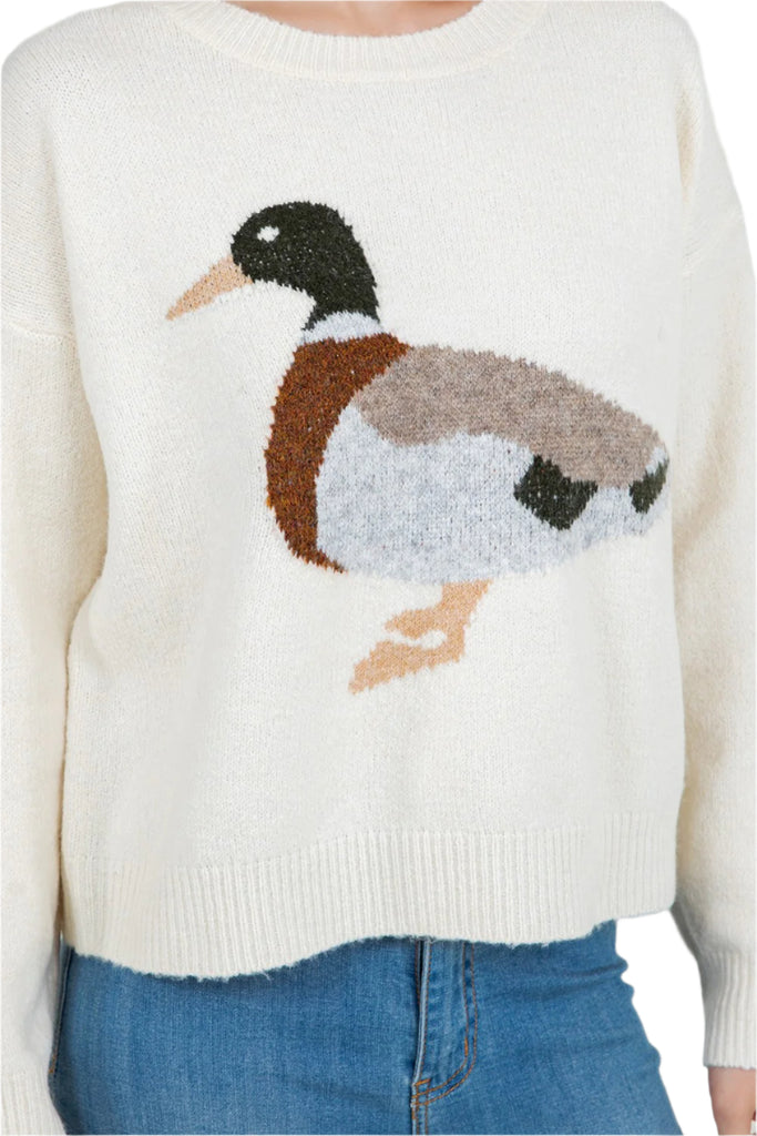 This soft knit sweater featuring a mallard duck graphic on the front features a relaxed fit and ribbed trim. A cozy and quirky piece with outdoorsy charm!