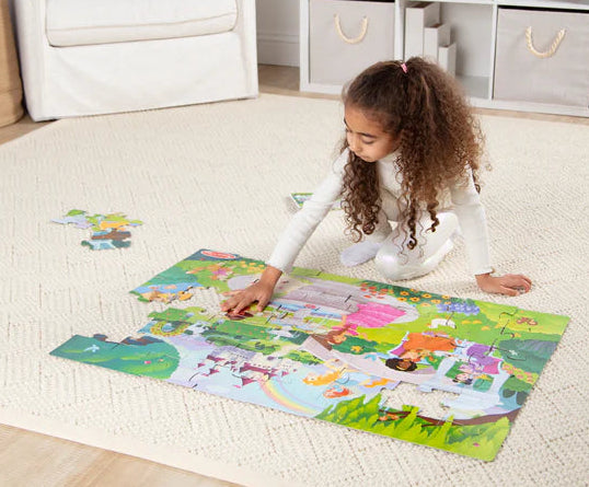 Dive into a fairy tale world with this 48-piece floor puzzle that forms a 3 x 2 ft castle scene when complete. The detailed picture includes a rainbow, fountain, flowers, princesses, and friendly animals kids can point to, name, and build stories around.