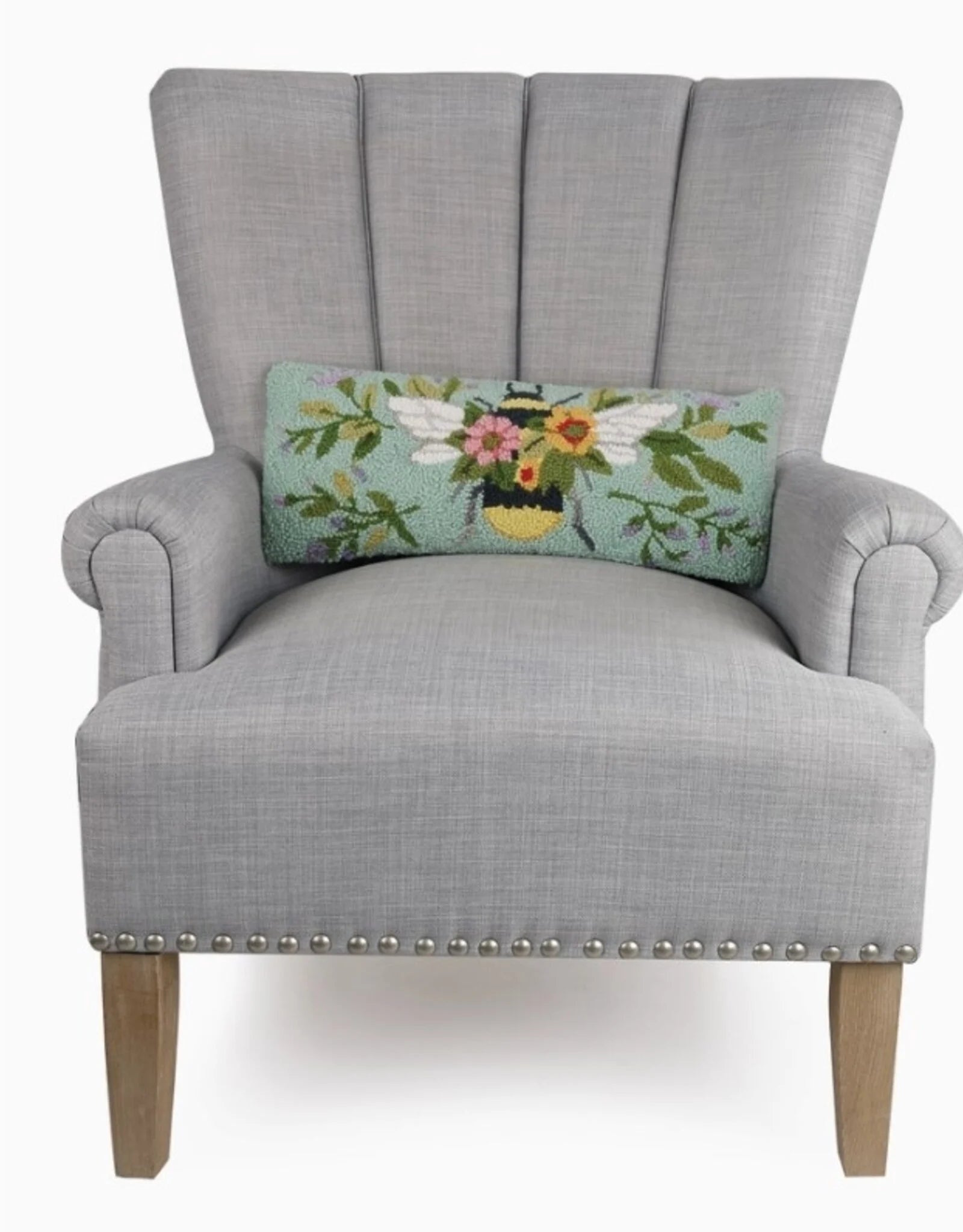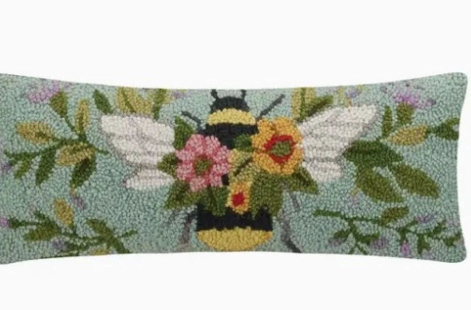 Add some charm to your decor with this handcrafted lumbar hooked wool pillow showcasing a bee among the colorful flowers!