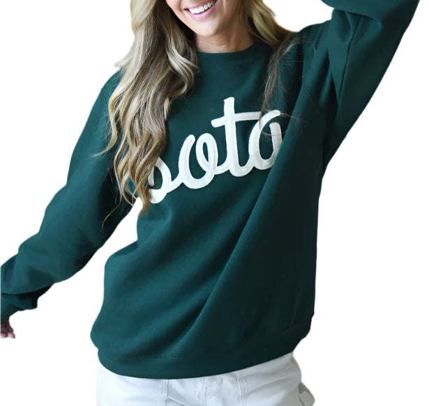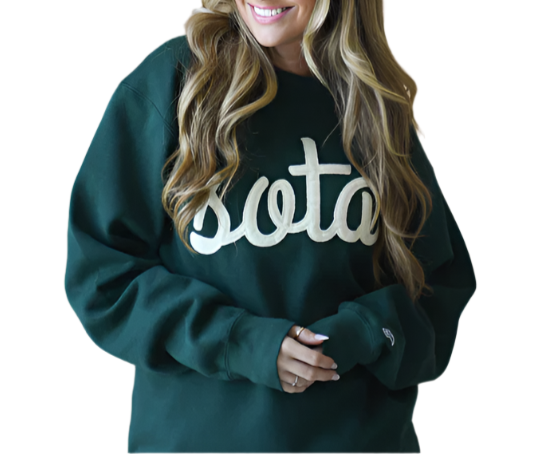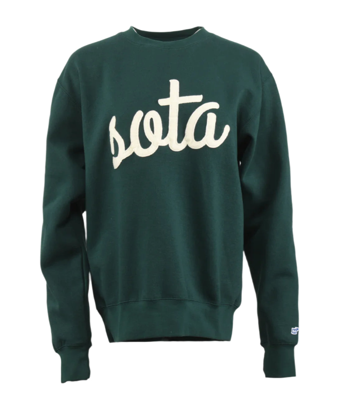 This timeless unisex item is the perfect addition to any wardrobe. Featuring a sophisticated mid weight fleece in a sleek forest color, this crewneck sweatshirt is enhanced with a classic cream "sota" script felt appliqué for a subtle, yet luxurious finish. For those who appreciate an exclusive style, this crewneck is just the item.