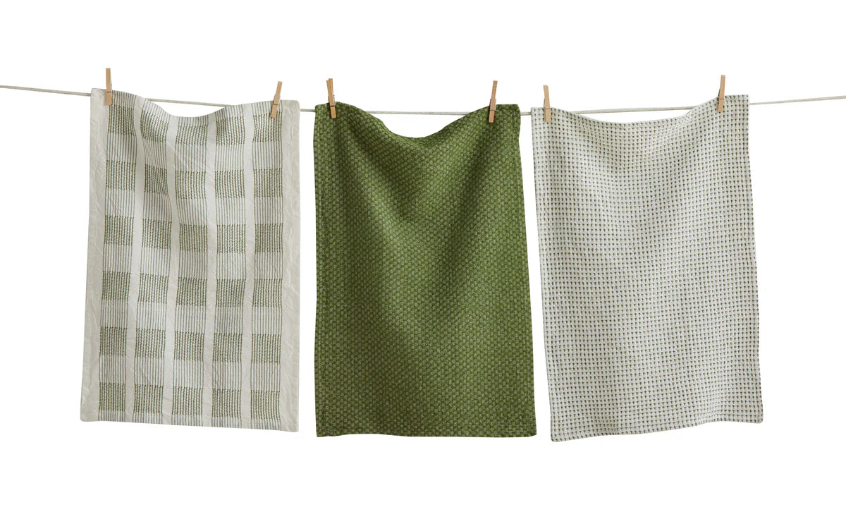 This set includes three green textural cotton dishtowels with hang loops, known for their exceptional absorbency, durability, and elevated style.