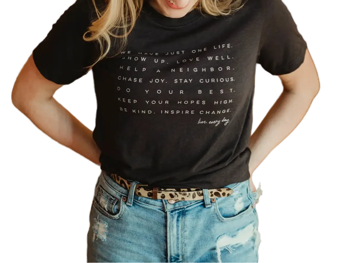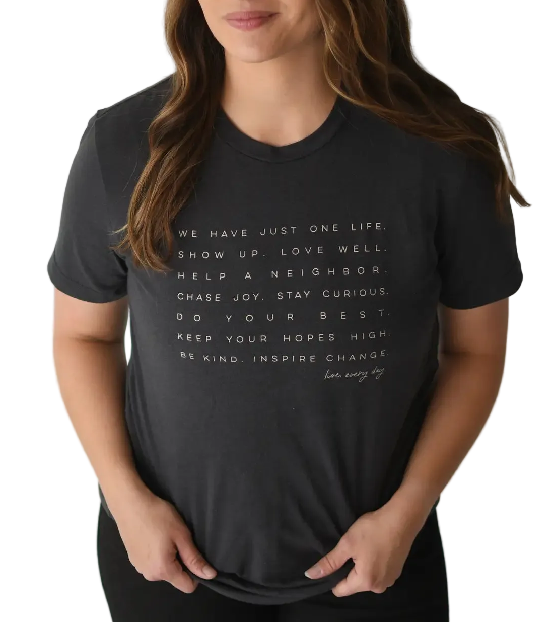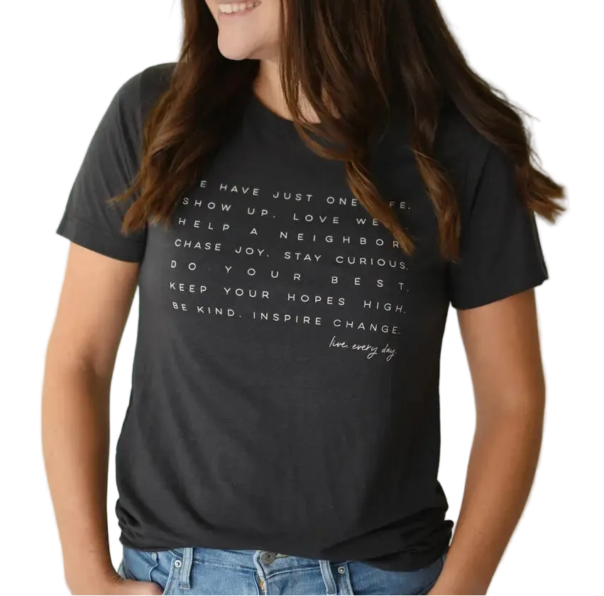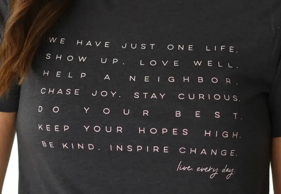 "Live. Every. Day. We have just one life. Show up. Love well. Help a neighbor. Chase joy. Stay curious. Do your best. Keep your hopes high. Be kind. Inspire change."