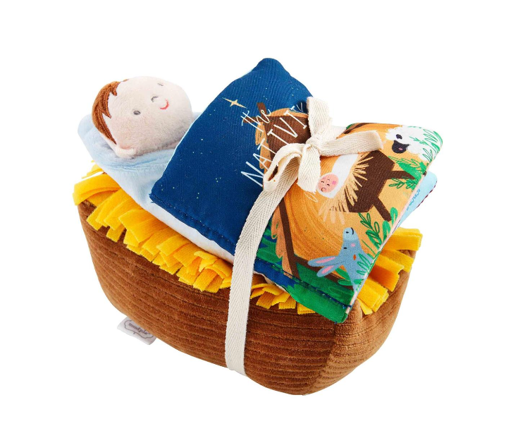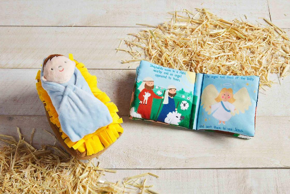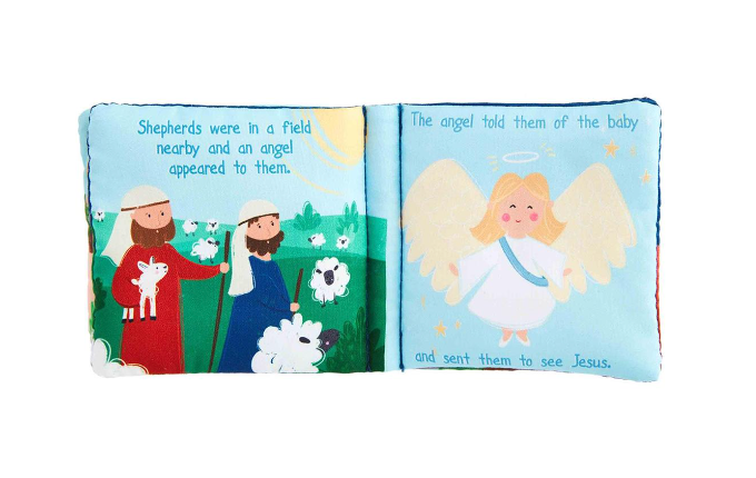 Your little one will love this 2-piece set of a soft baby safe book about the birth of Jesus and a minky and chenille singing Jesus in the manger!