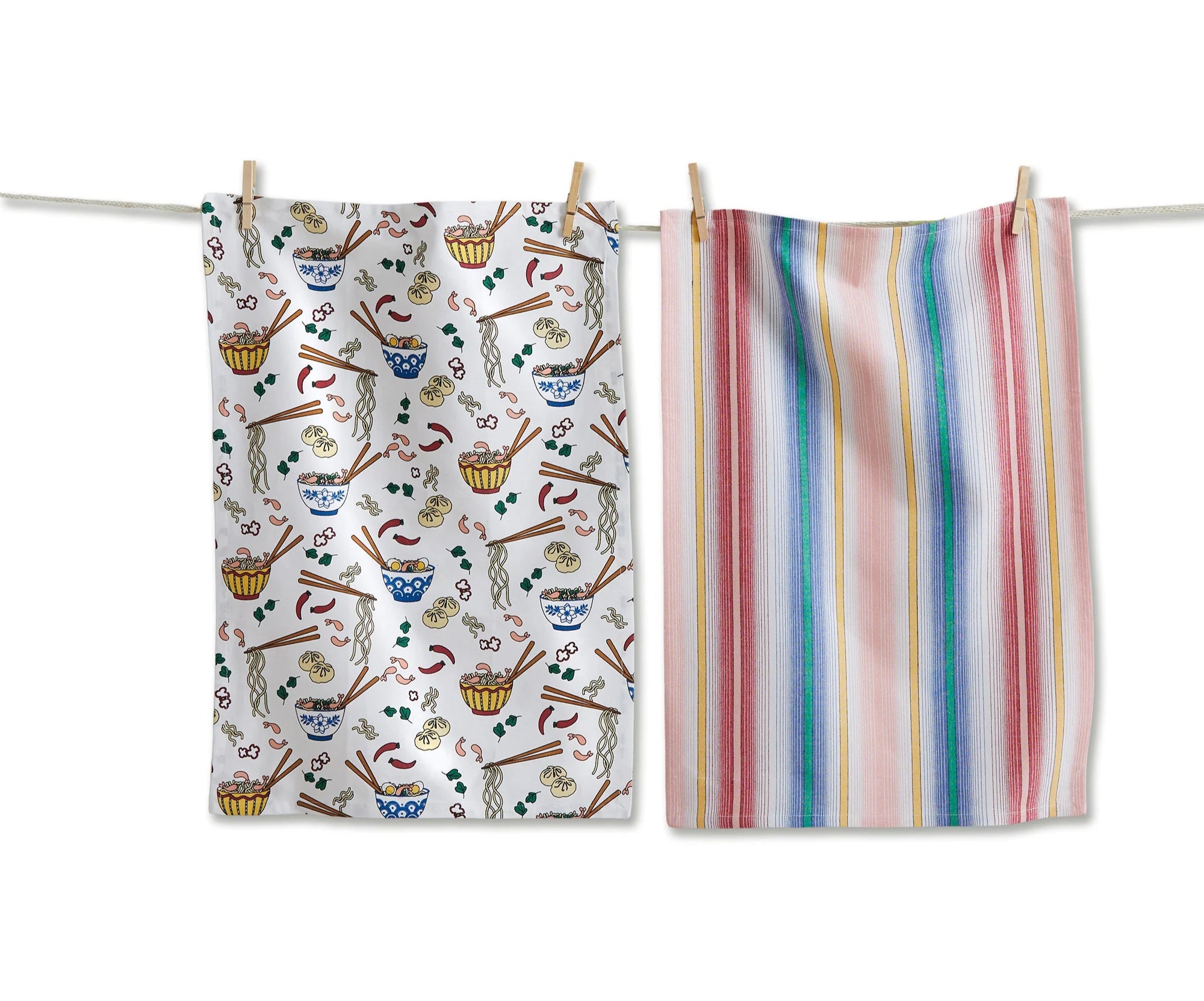 This set includes one multicolor stripe cotton dishtowel and one printed with ramen noodles and dumplings, both with hang loops.