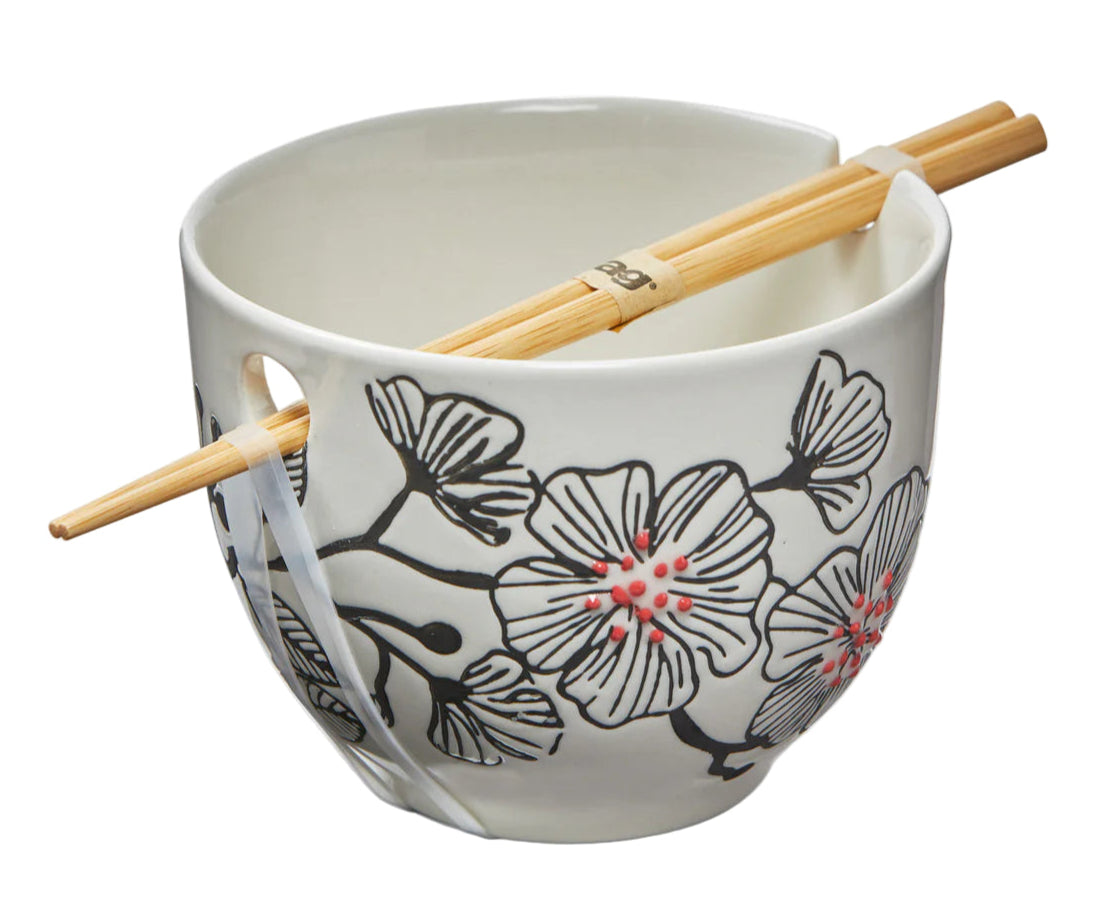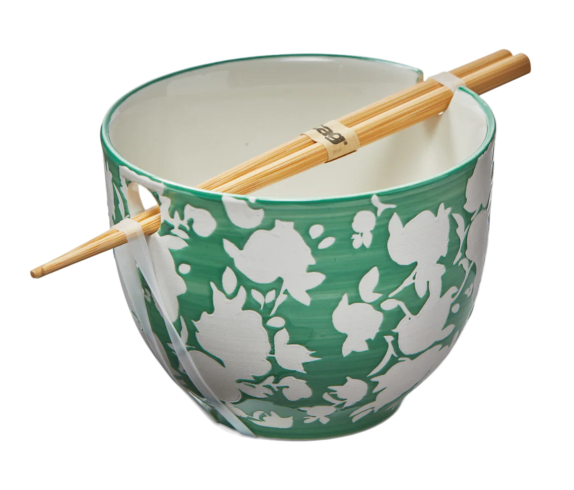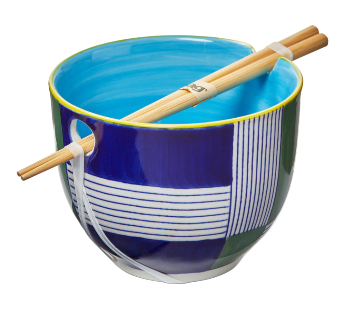 This noodle bowl set features a design created with a wax resist and hand-painted technique. Each bowl comes with a pair of bamboo chopsticks. Great for gifting!