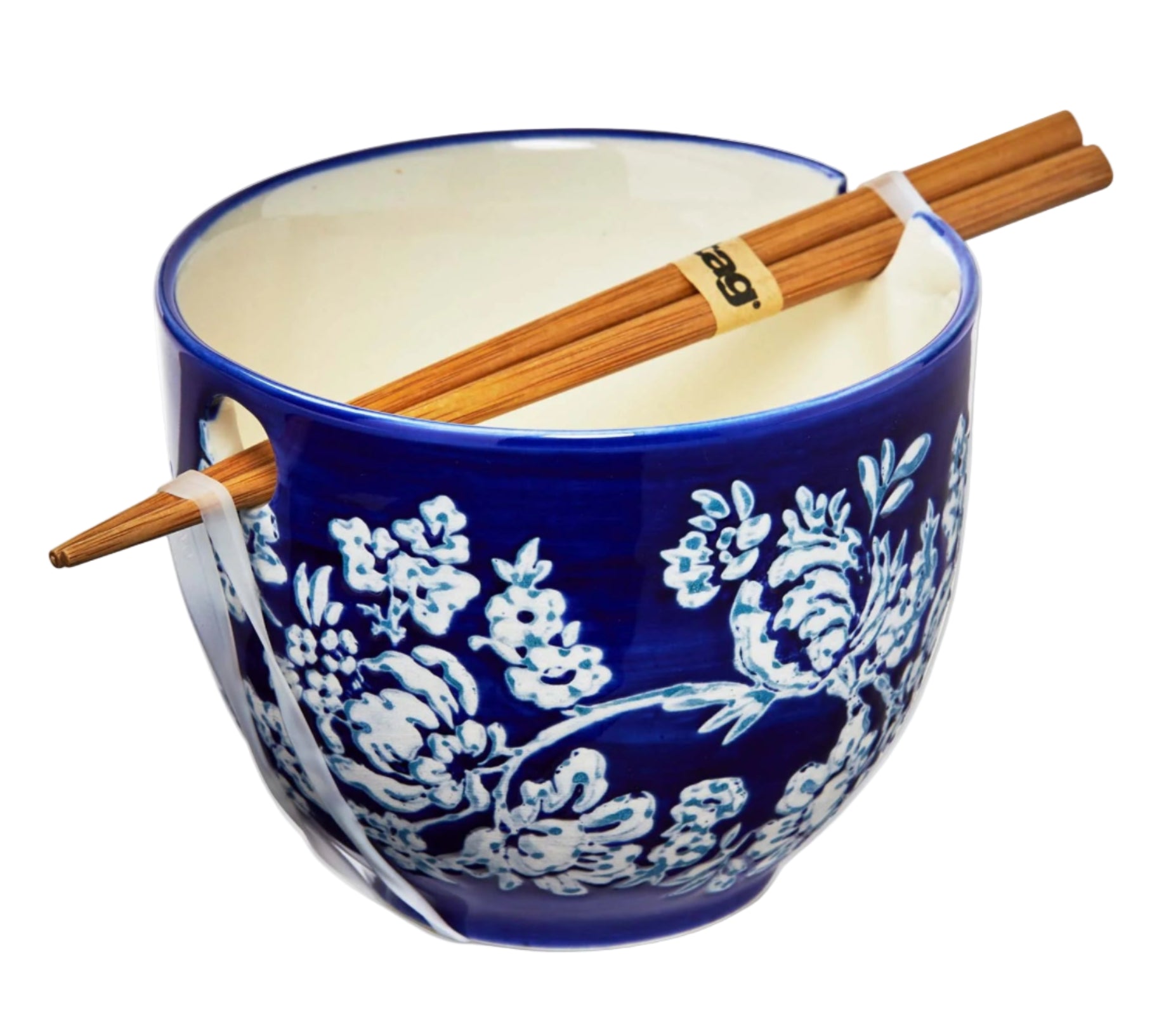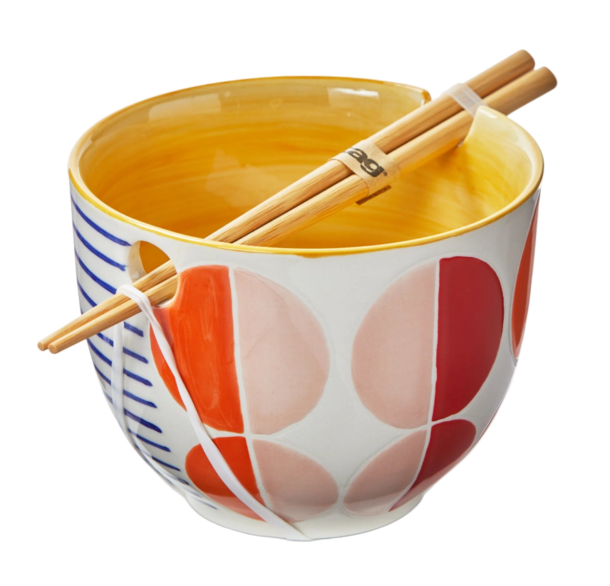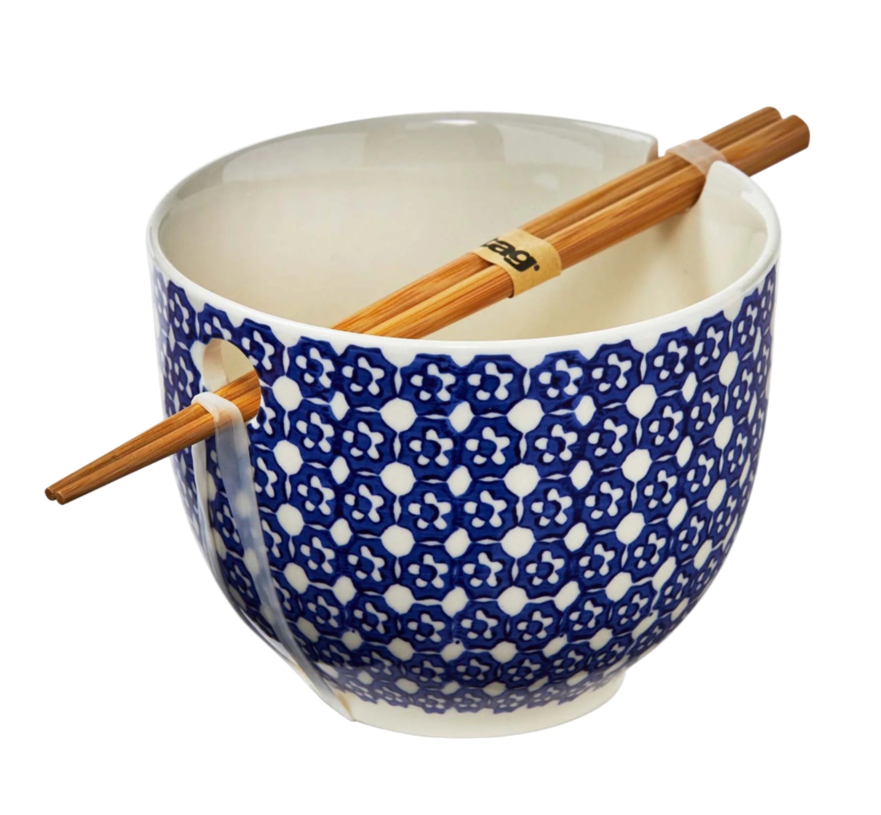 This noodle bowl set features a design created with a wax resist and hand-painted technique. Each bowl comes with a pair of bamboo chopsticks. Great for gifting!