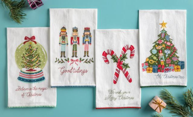 Cotton hand towel with contrast mini pom trim; perfect for the holidays!