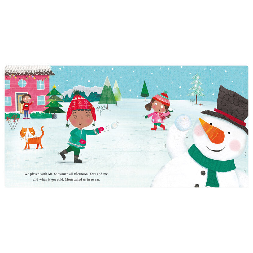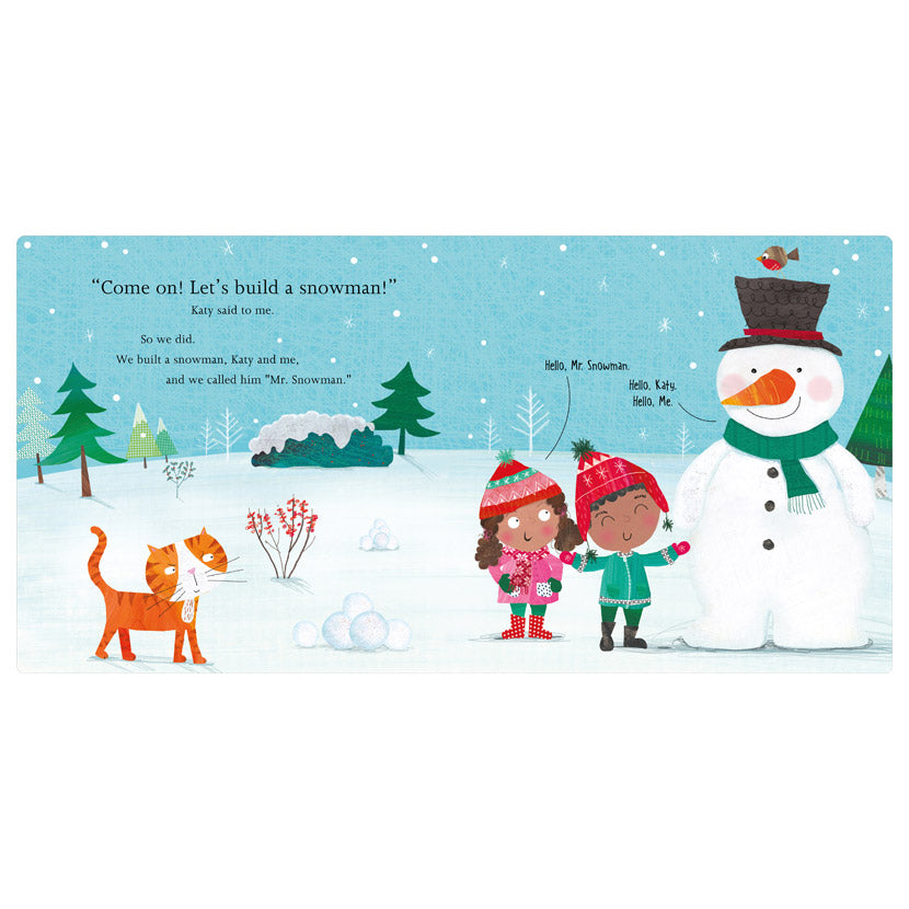 Katy and her brother build a magical snowman. When it gets too cold to play outside, they go into the house – but Mr. Snowman wants to come in, too! What follows is a humorous tale as Mr. Snowman tries to sneak in without anyone noticing. Everywhere he goes, things freeze! From crystals on the dinner plates, to icebergs in the bath, Mr. Snowman is found and asked to leave every time. But on the day of the Christmas party, something goes wrong. The desserts won’t set and the ice cream melts…!