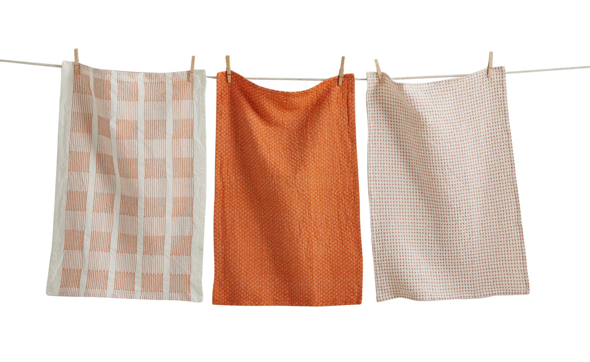 This set includes three orange textural cotton dishtowels with hang loops, known for their exceptional absorbency, durability, and elevated style.