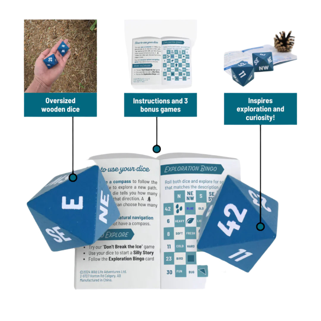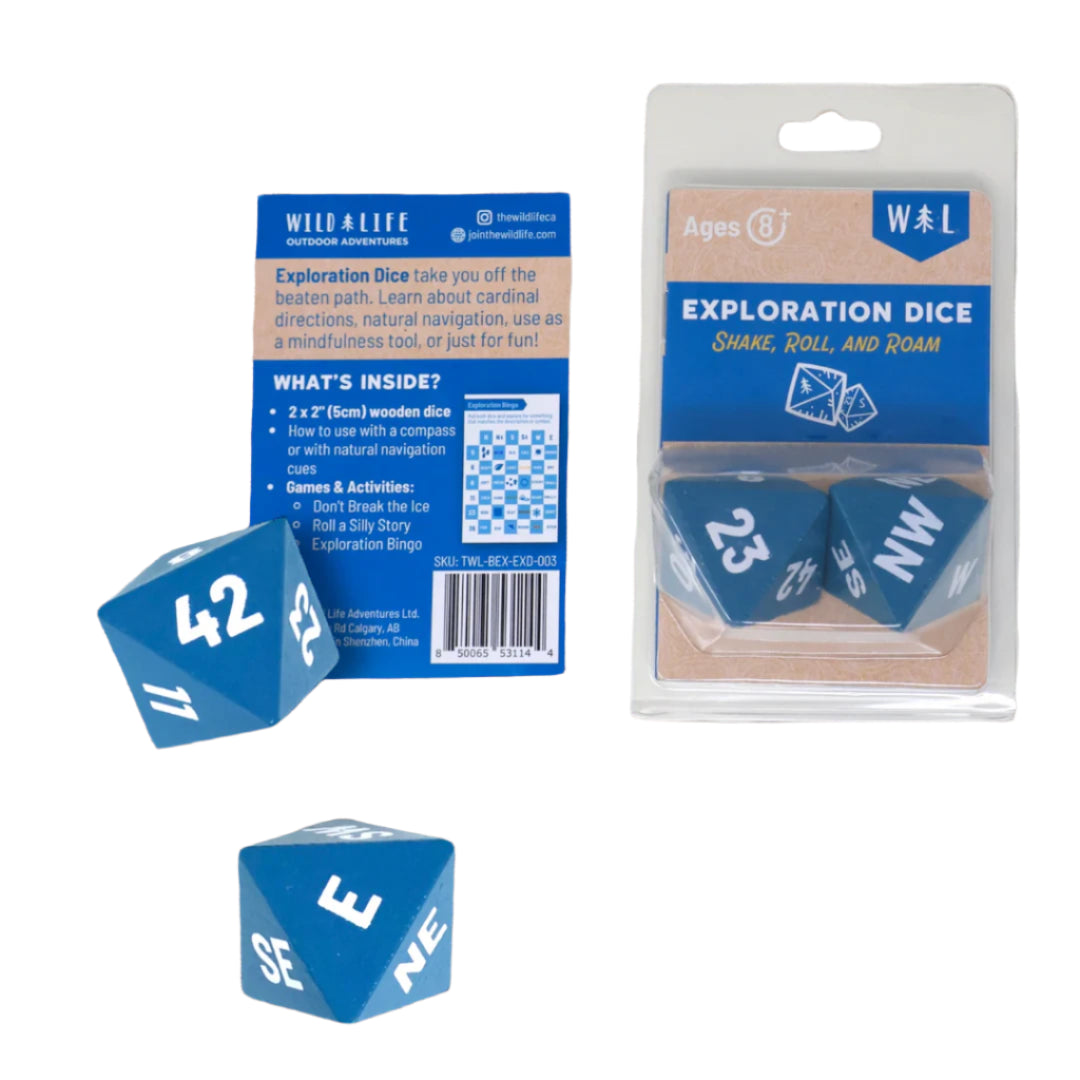 Take your outdoor adventures to the next level with the Exploration Dice! These oversized 8-SIDED wooden dice challenge you to navigate using cardinal directions and step counts, with bonus games included for endless fun.