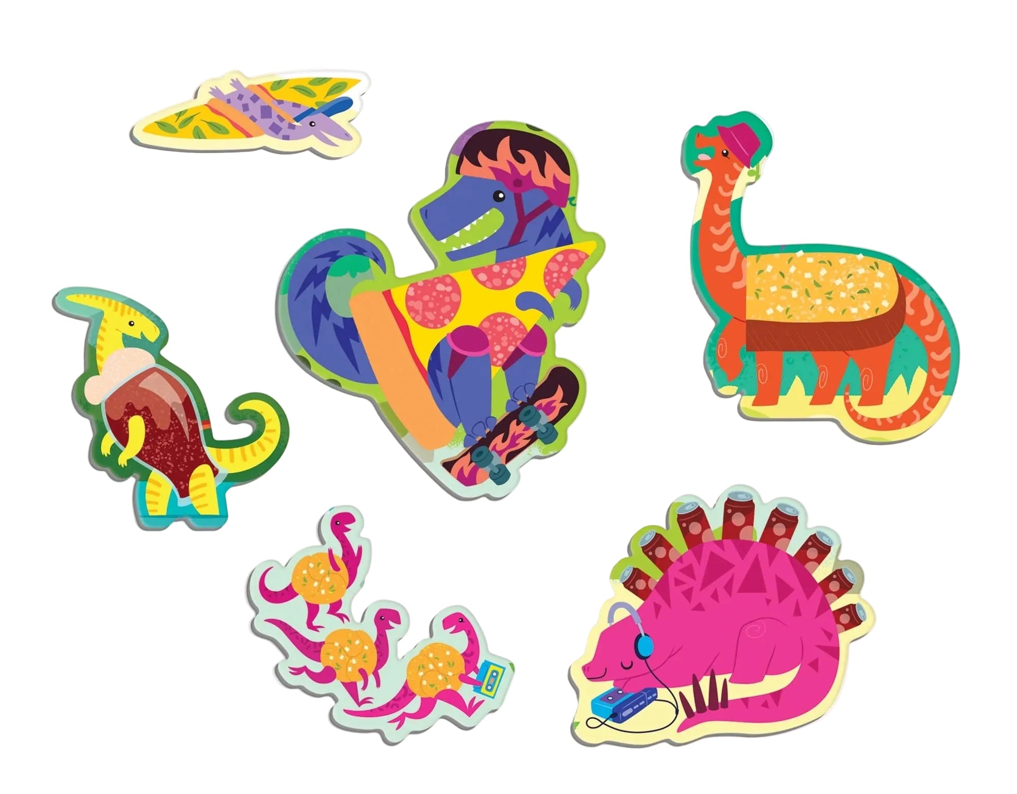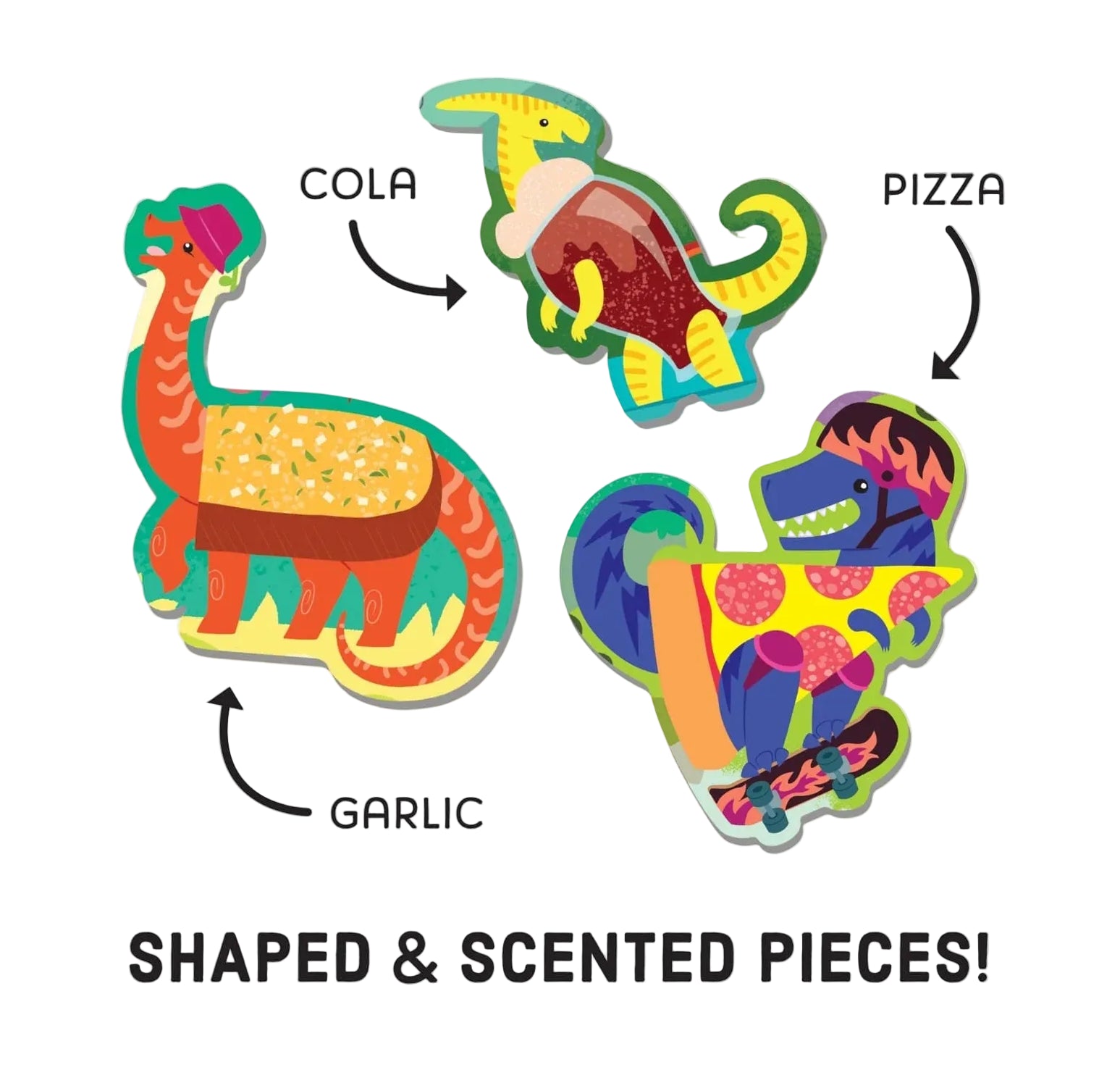 Children will love the scents found in Pizzasaurus 60 Piece Scratch & Sniff Puzzle. This puzzle includes 60 puzzle pieces, featuring 6 special shaped pieces with 3 of your favorite Dino-scents β pizza, garlic, and cola!