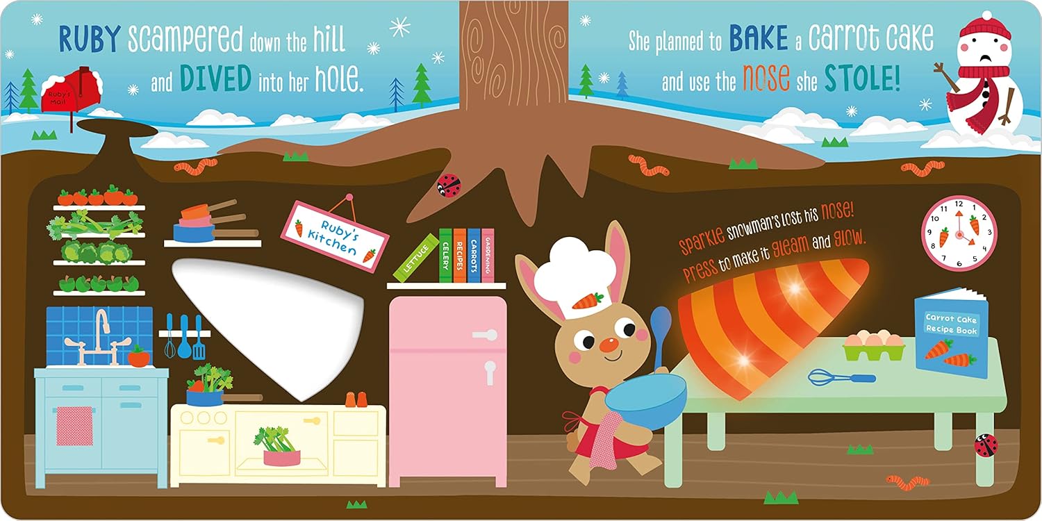 When Ruby Rabbit pinches Sparkle Snowman’s glowing carrot nose, Sparkle feels lost without it! Join Sparkle and Ruby in this sweet story, as the lovable snowman learns that sharing is the key to friendship. This exciting board book features adorable illustrations, fun rhymes, and a flashing light that brings every page to life.