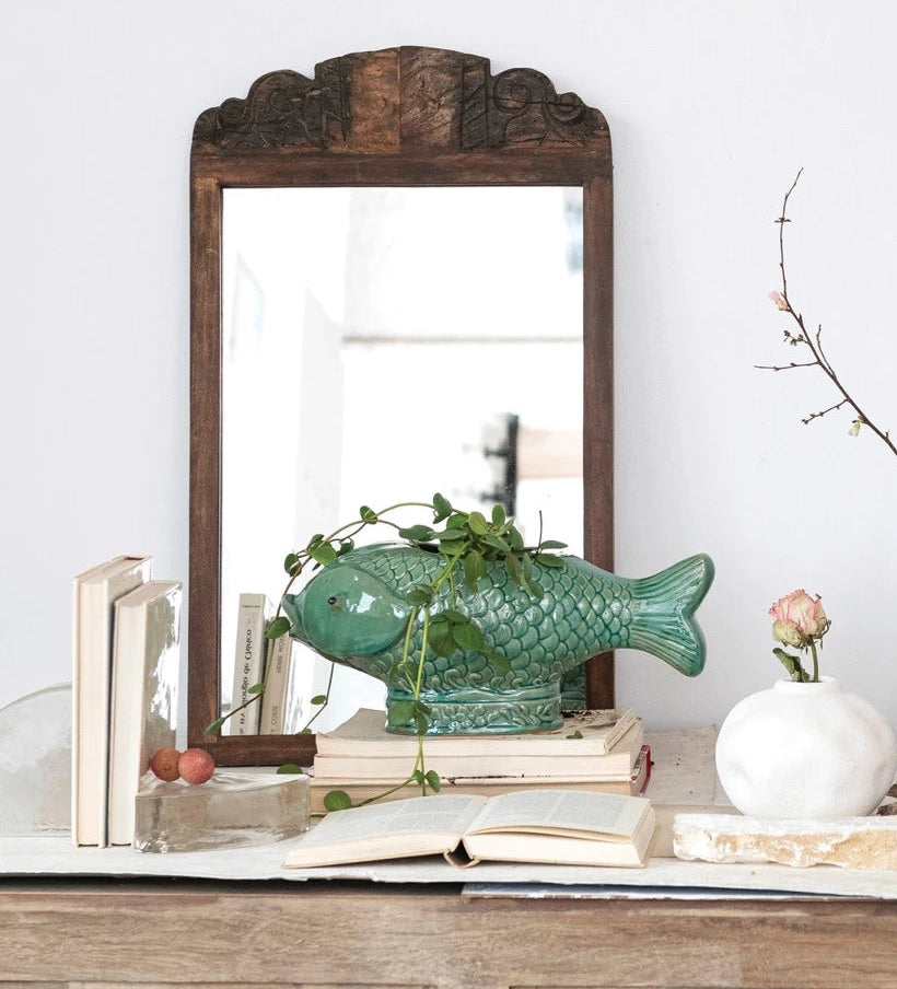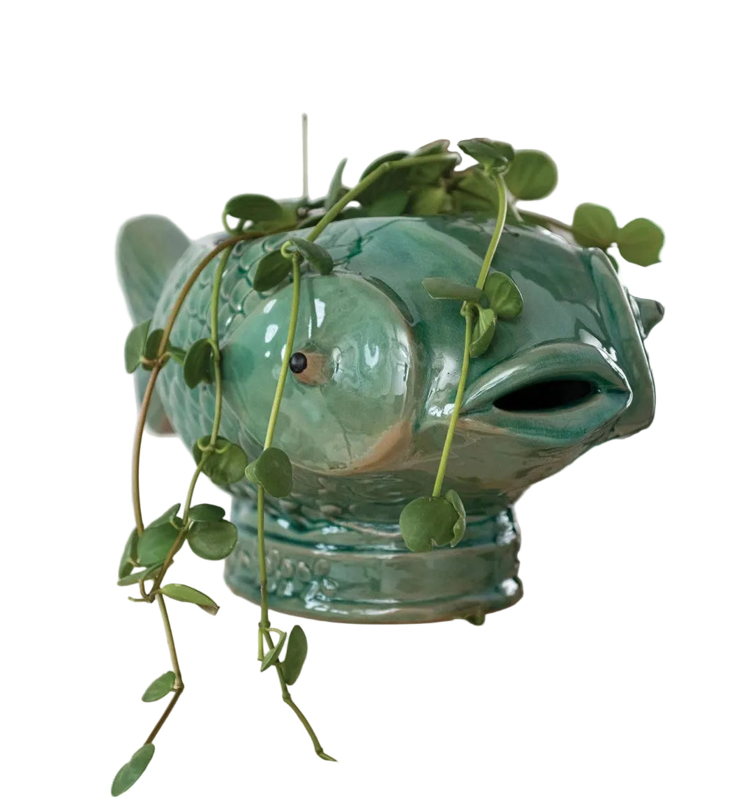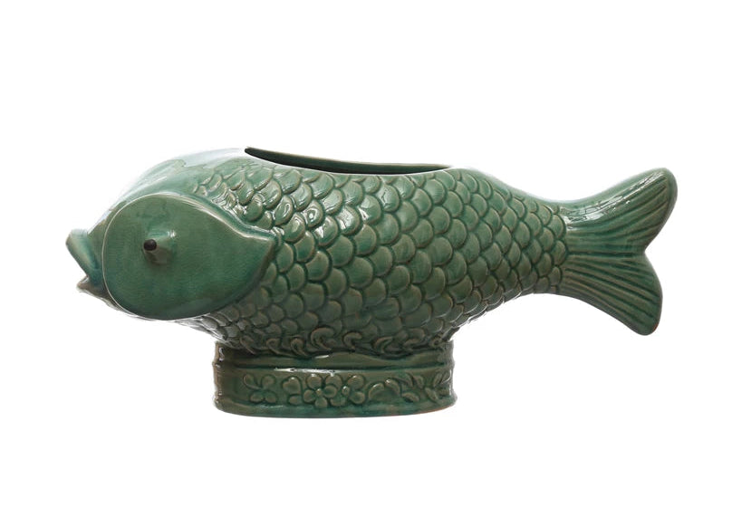 This stoneware fish planter with debossed design and reactive glaze in turquoise is a lovely piece that can brighten up any space!