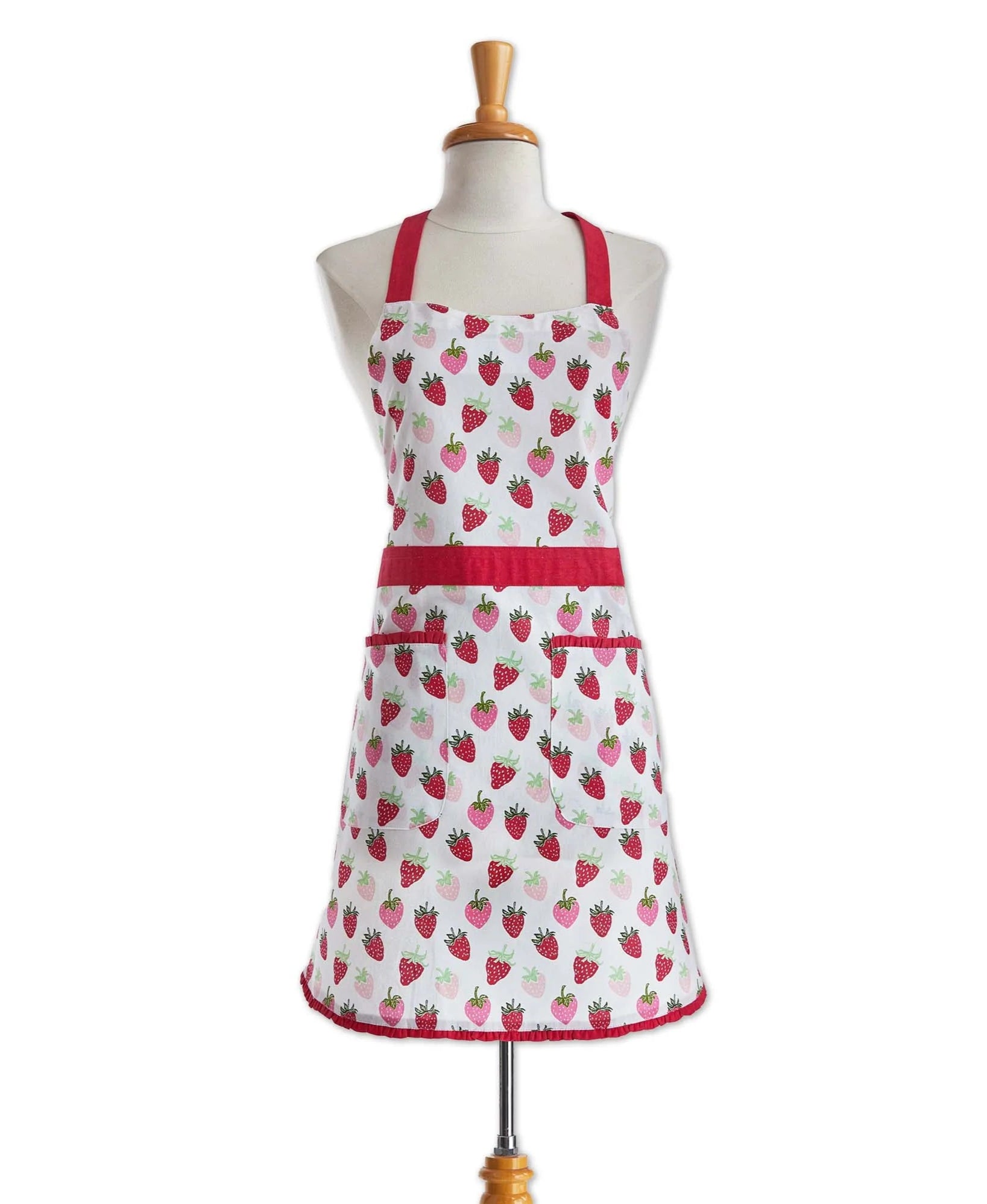 Hand screen printed on pink cotton, this apron features a delightful strawberry design and boasts a comfortable fit with adjustable neck and waist ties, two pockets for convenience, and a touch of femininity with a ruffled trim.