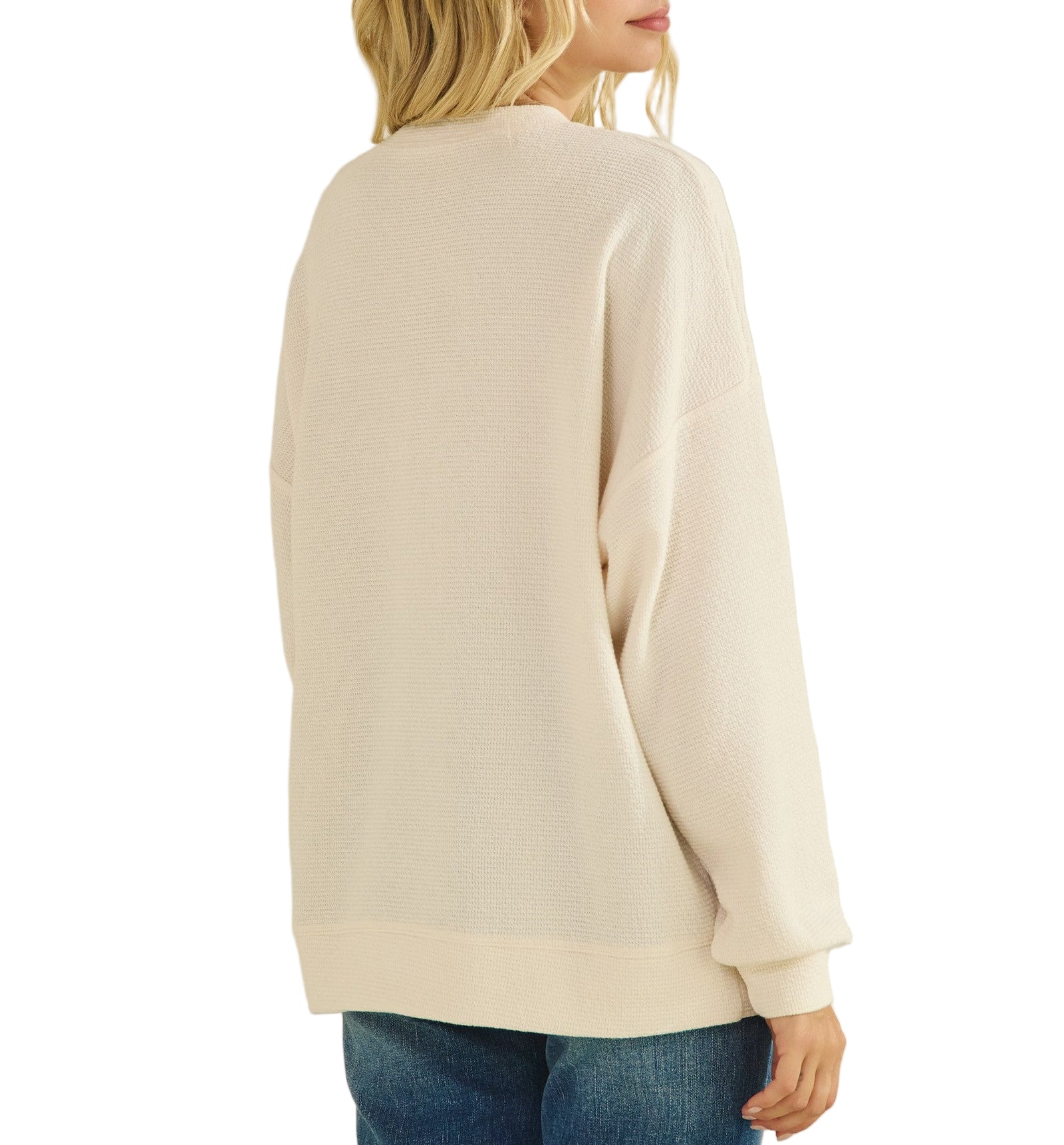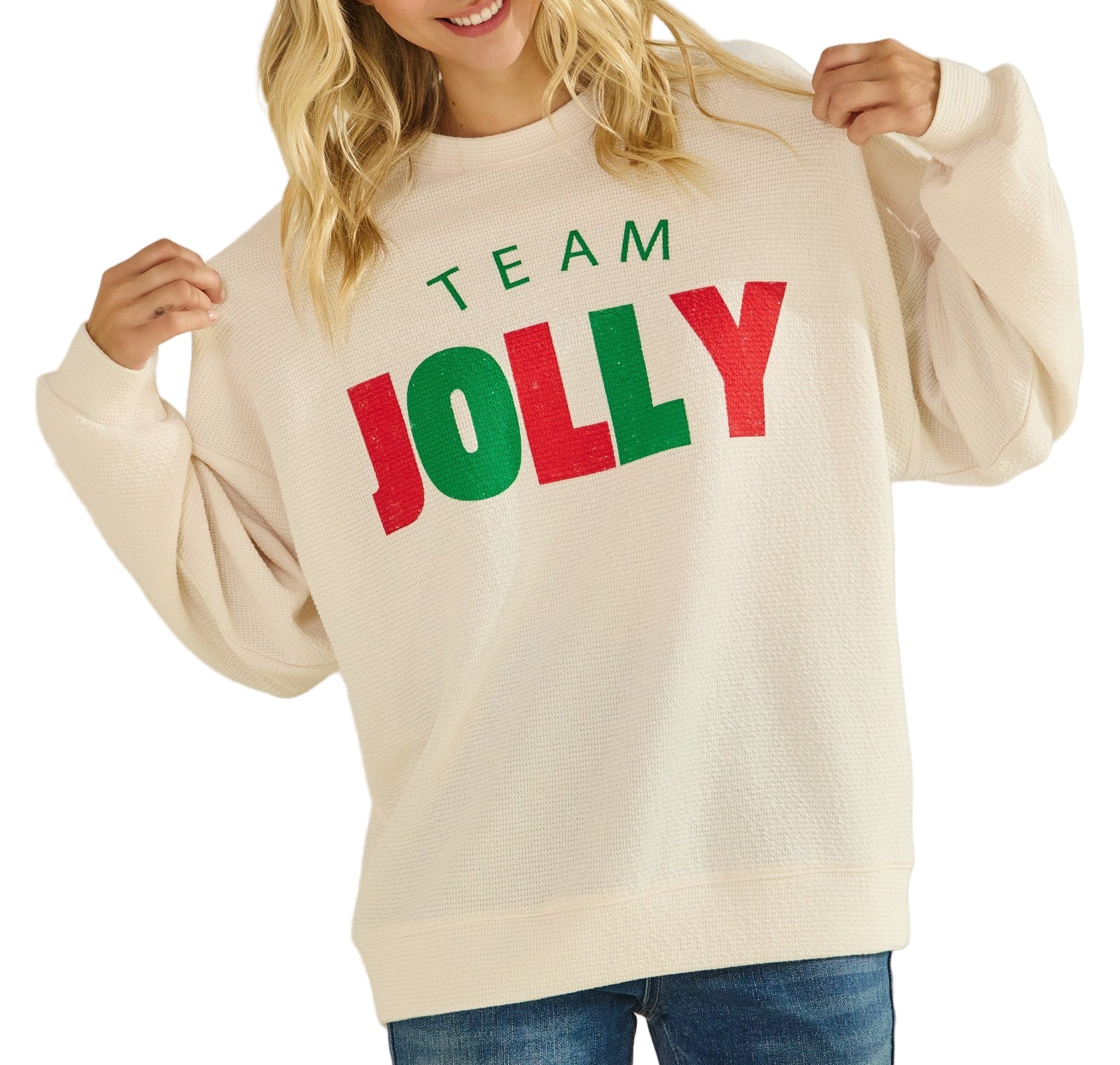 This cream long sleeve top is fun and festive with the words "Team Jolly".