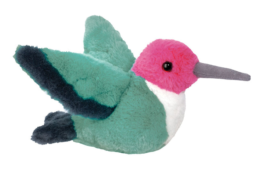 With her vibrant pink head, emerald green wings, and soft gray beak, this Twirlie Hummingbird plush perfectly captures the beauty of nature's tiniest bird.